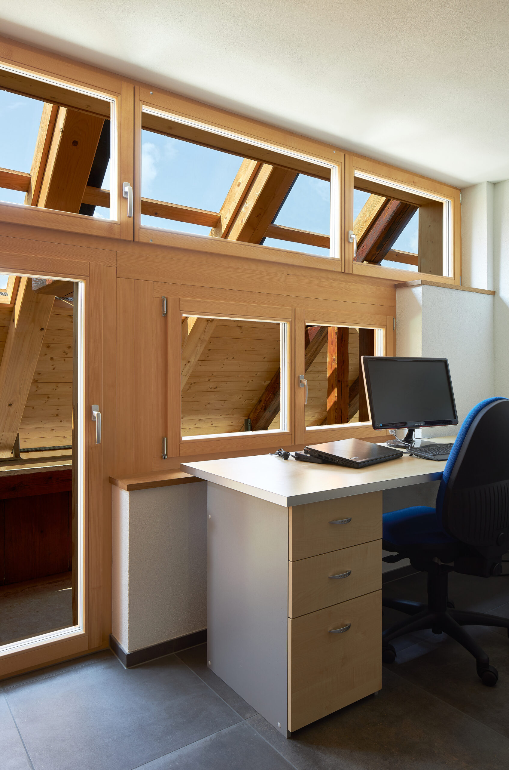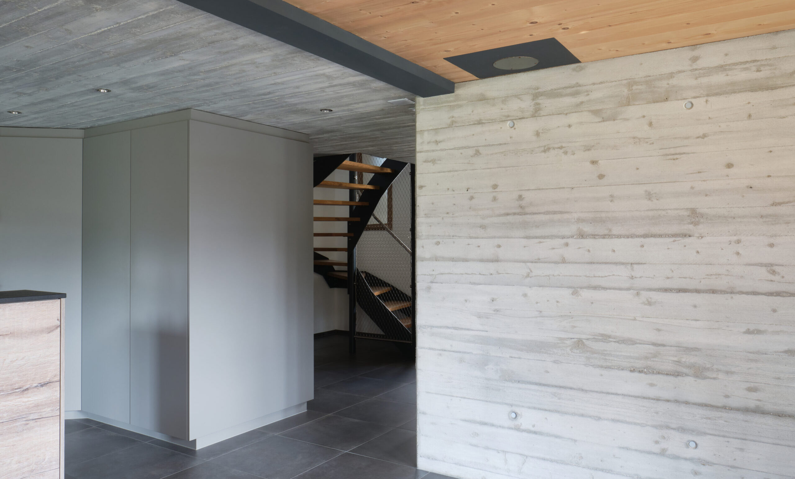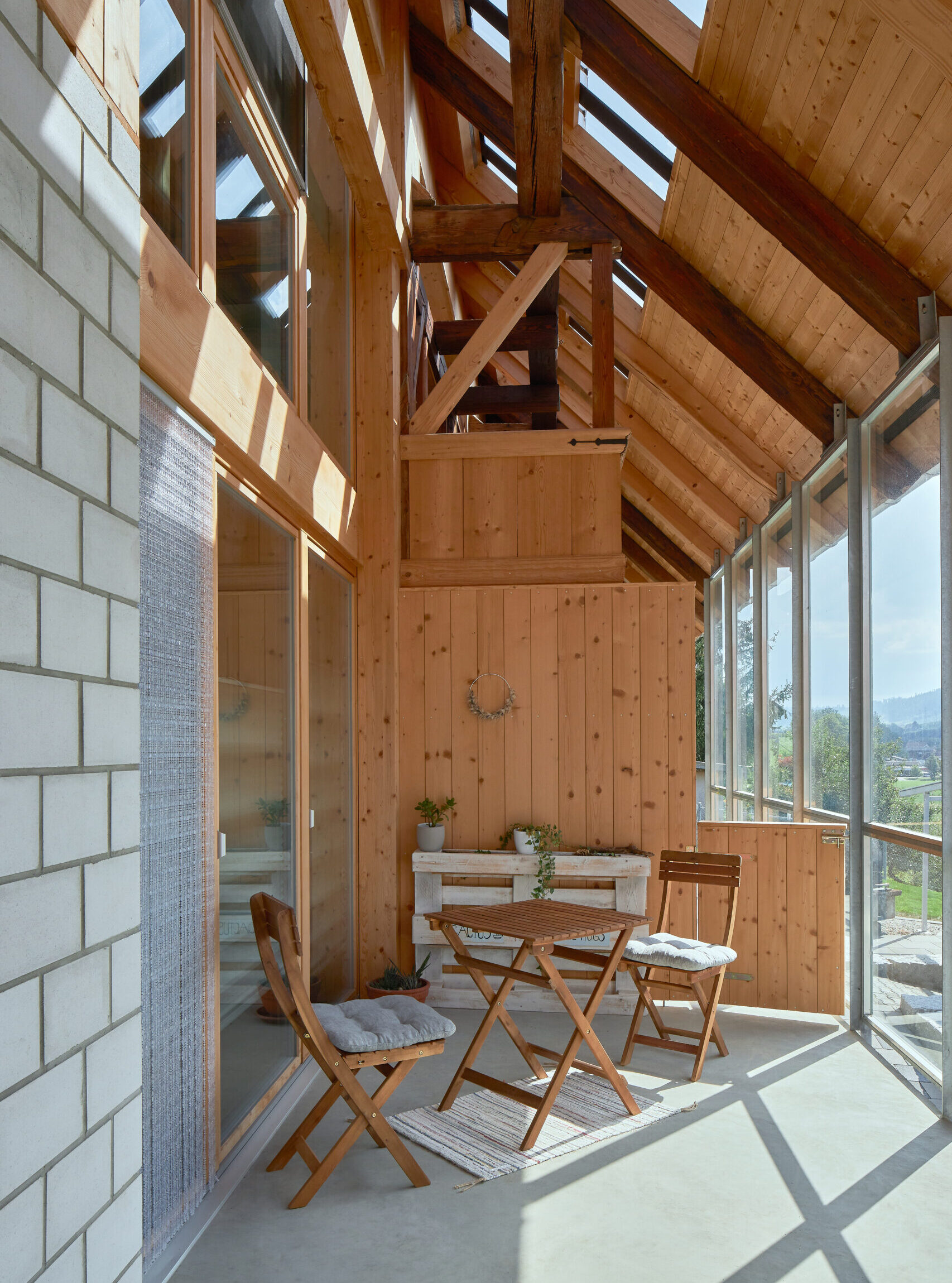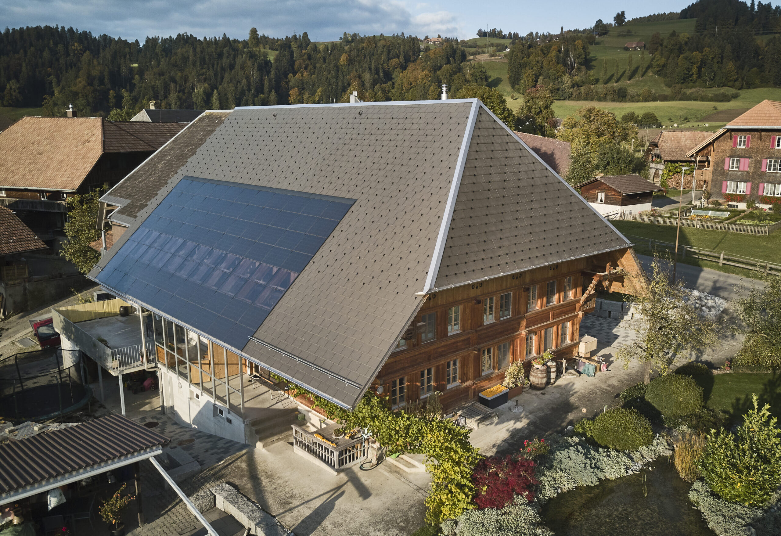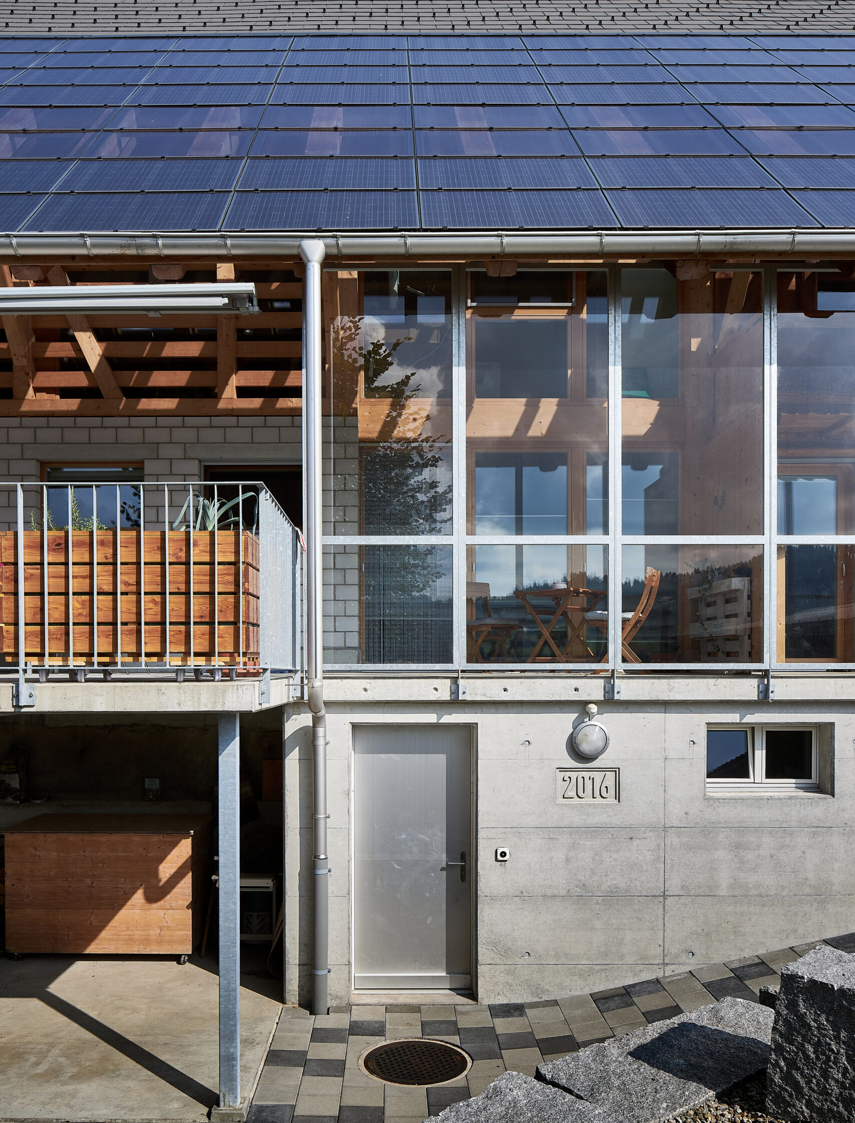 Gefragt waren Ideen für alternative Baumaterialien. Neben Holz integrierten wir auch Bauteile aus Stahl und Beton. Das Gebäude wird mit einer Wärmepumpe geheizt. Die Energie wird aus der Aussenluft und dem Solarstrom der dachintegrierten Photovoltaik erneuerbar gewonnen.
