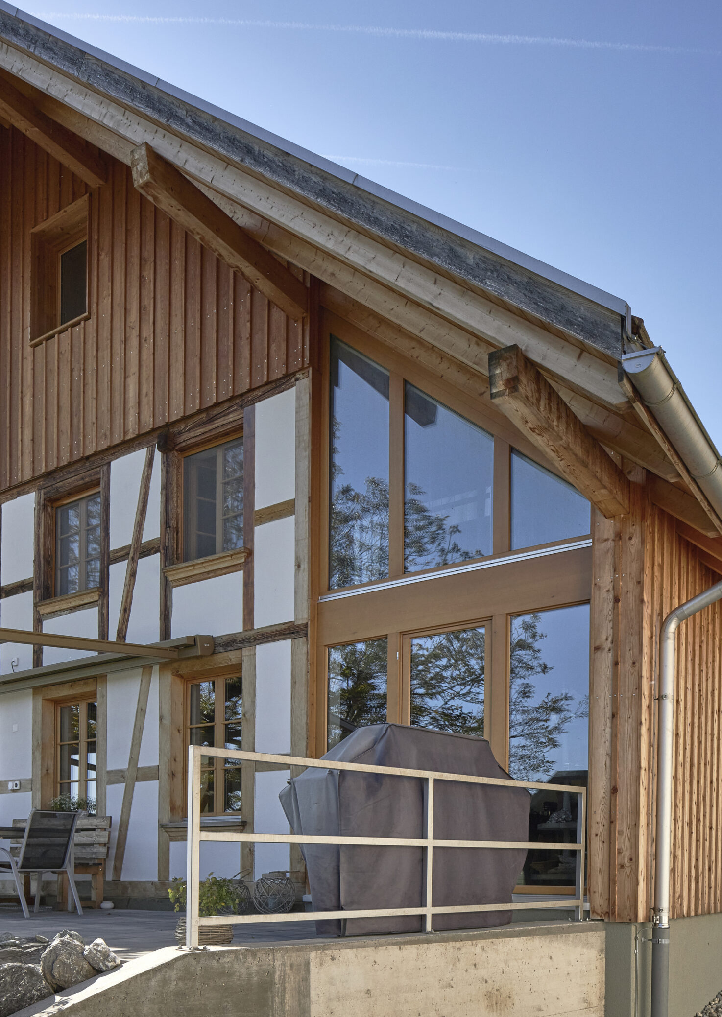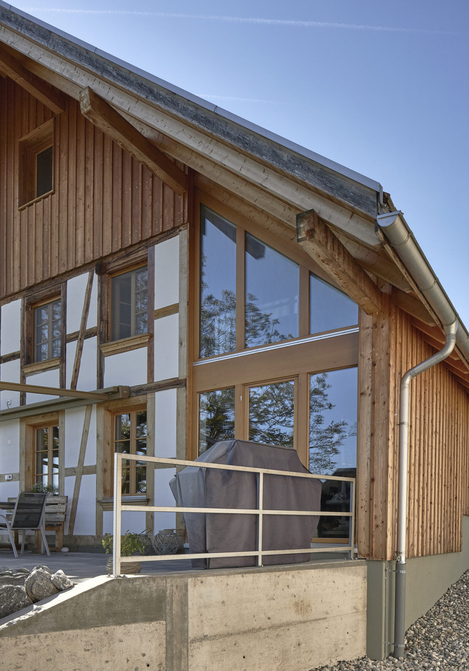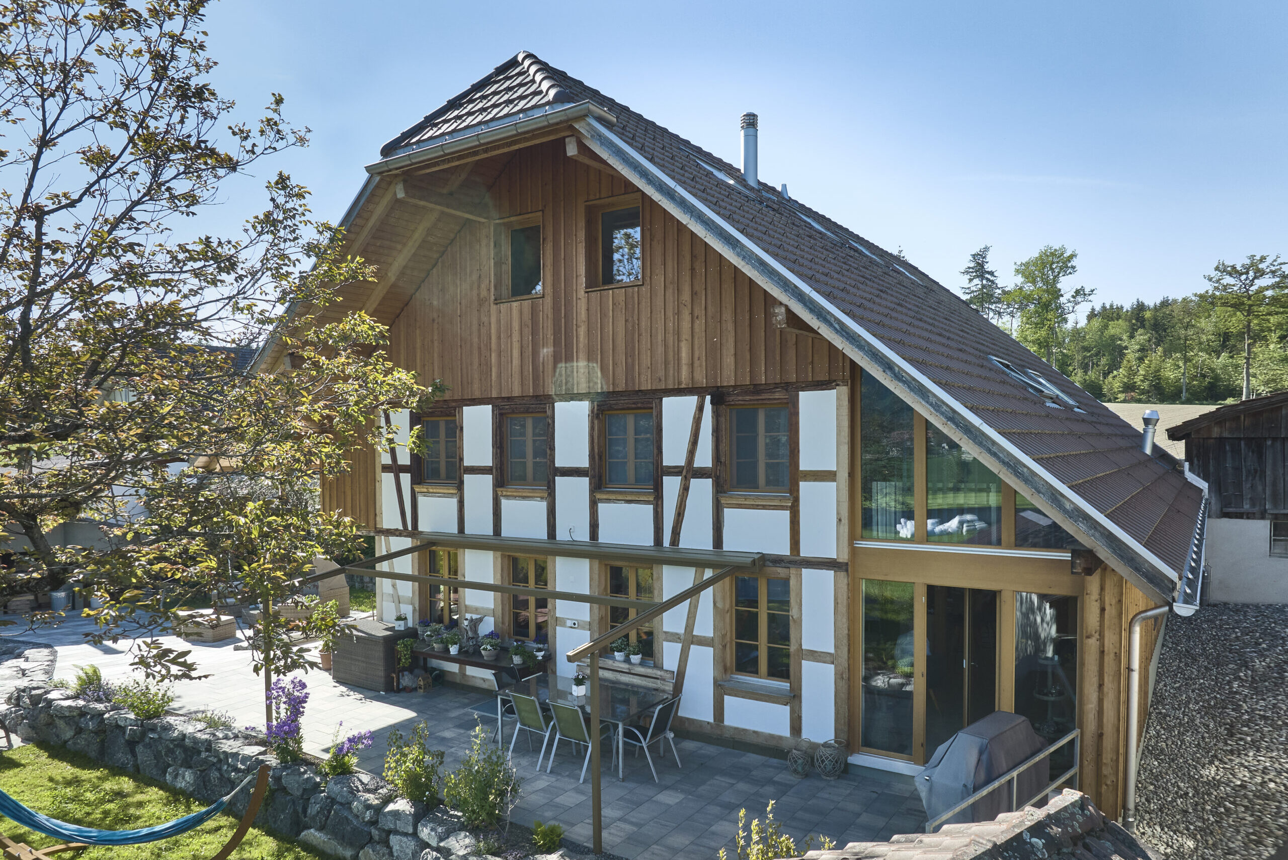 Die Baustruktur bildet ein altes Bauernhaus, das im Ortsbildschutzgebiet integriert ist. Zuerst wurde die marode Dachkonstruktion mit einem komplett neuen Dachstuhl ersetzt. Gleichzeitig wurde die bestehende Wohnung im Erd- und Obergeschoss durch den Ausbau der Tenne vergrössert – der neuen Nutzung dienend wurde das alte Holztor durch eine grosse Glasfront ersetzt. Im Aussenbereich entstand zudem eine komplette Neugestaltung der Umgebung inklusive Pool.