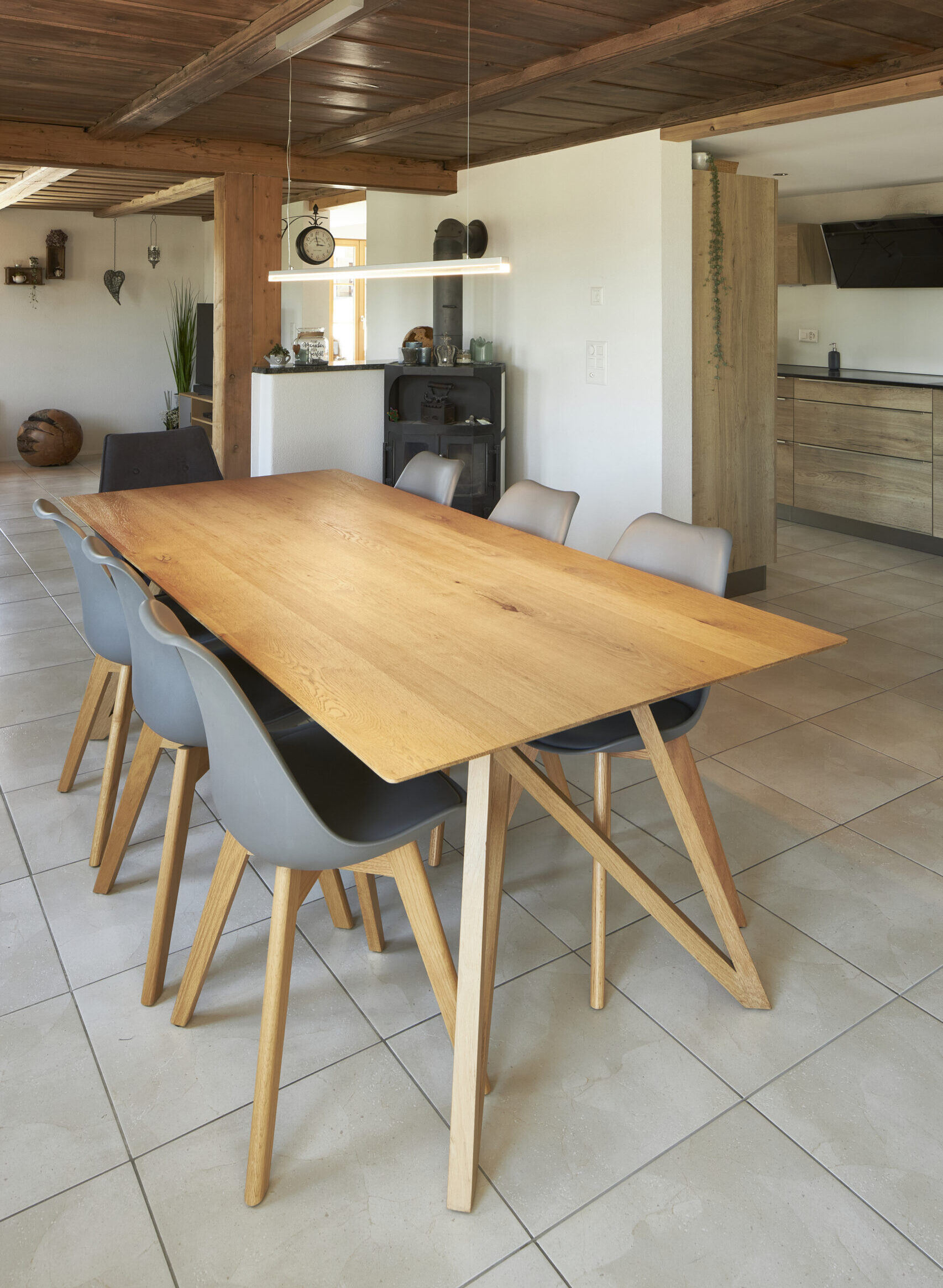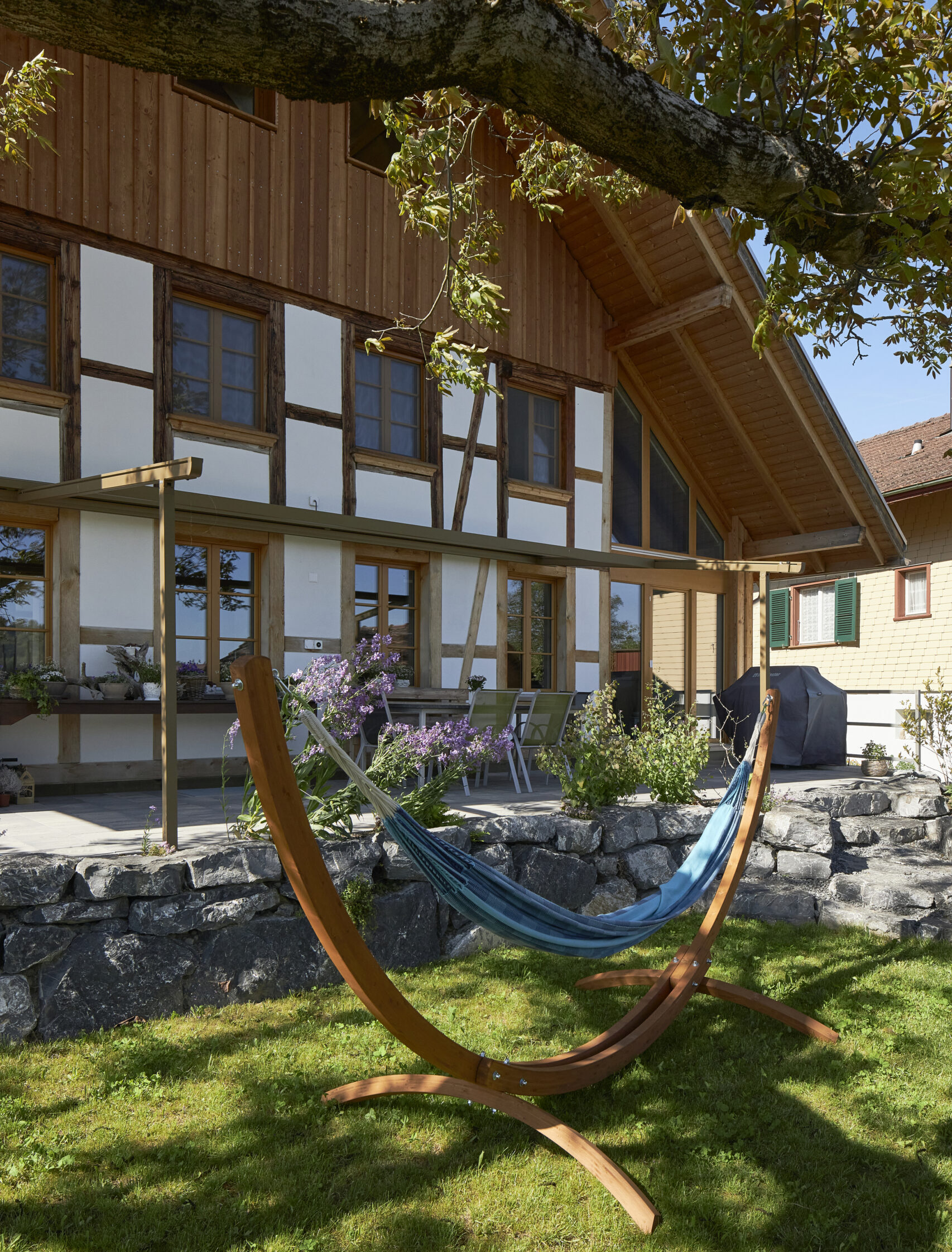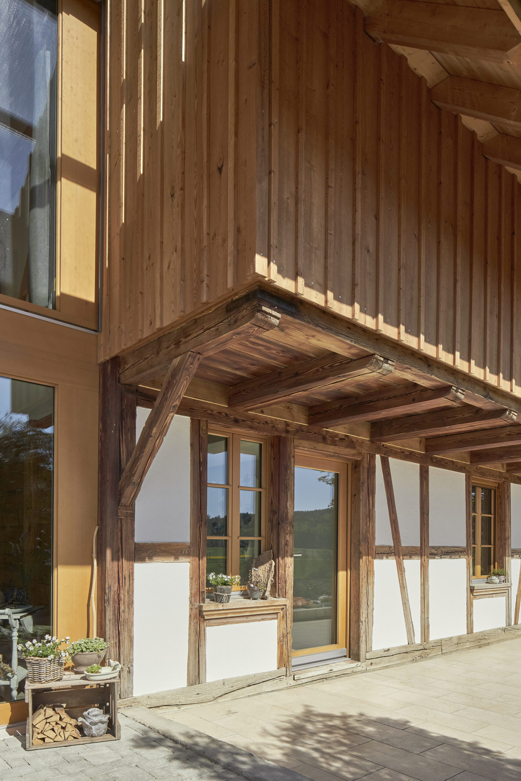 Die Baustruktur bildet ein altes Bauernhaus, das im Ortsbildschutzgebiet integriert ist. Zuerst wurde die marode Dachkonstruktion mit einem komplett neuen Dachstuhl ersetzt. Gleichzeitig wurde die bestehende Wohnung im Erd- und Obergeschoss durch den Ausbau der Tenne vergrössert – der neuen Nutzung dienend wurde das alte Holztor durch eine grosse Glasfront ersetzt. Im Aussenbereich entstand zudem eine komplette Neugestaltung der Umgebung inklusive Pool.