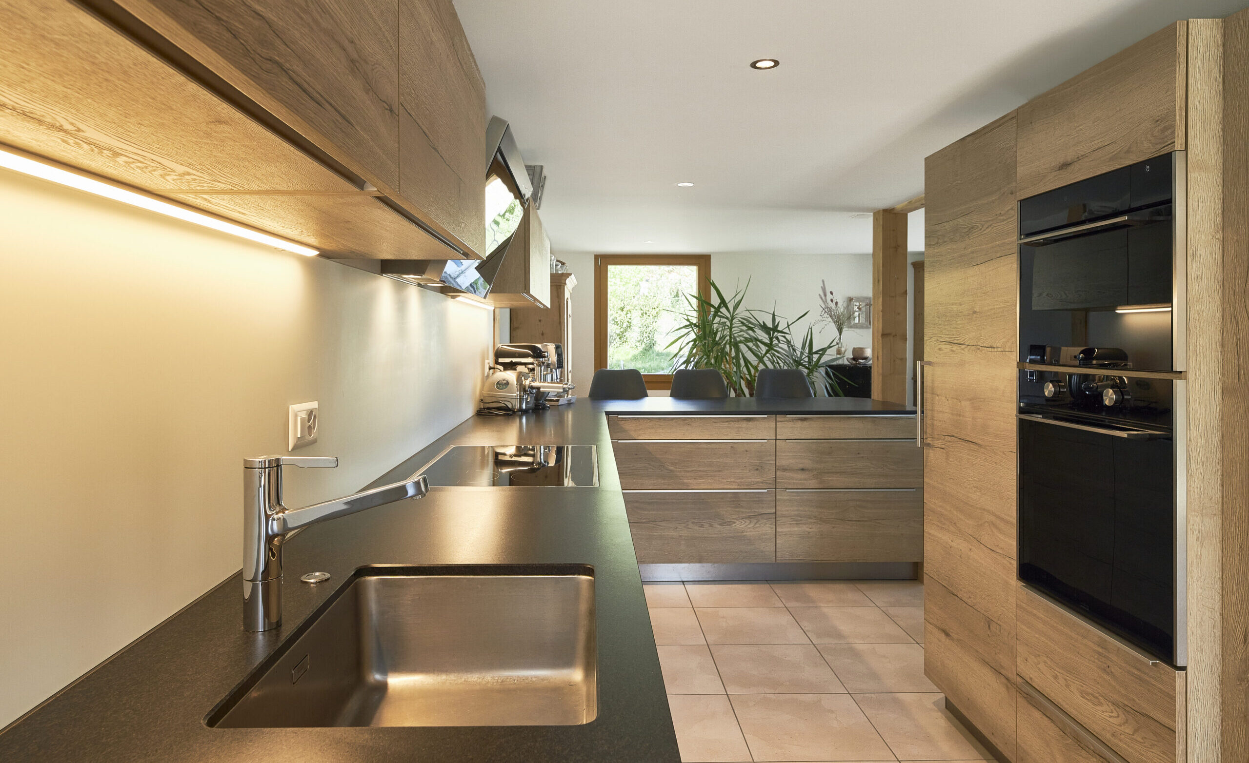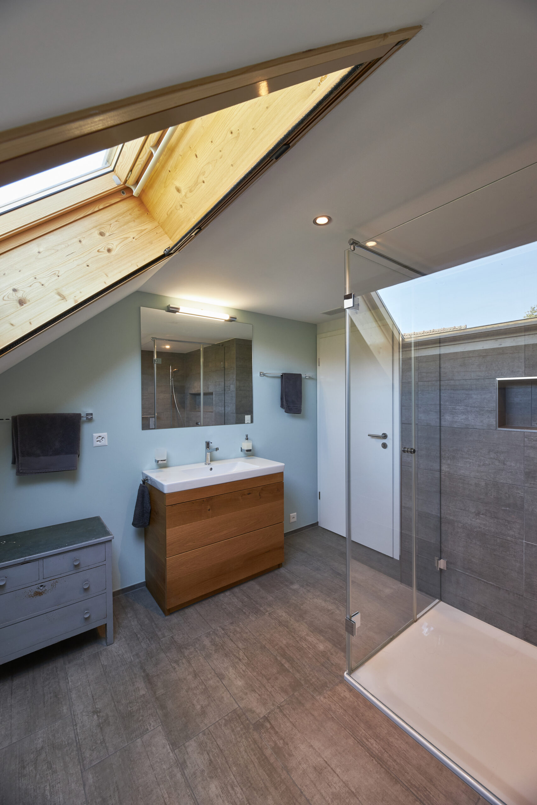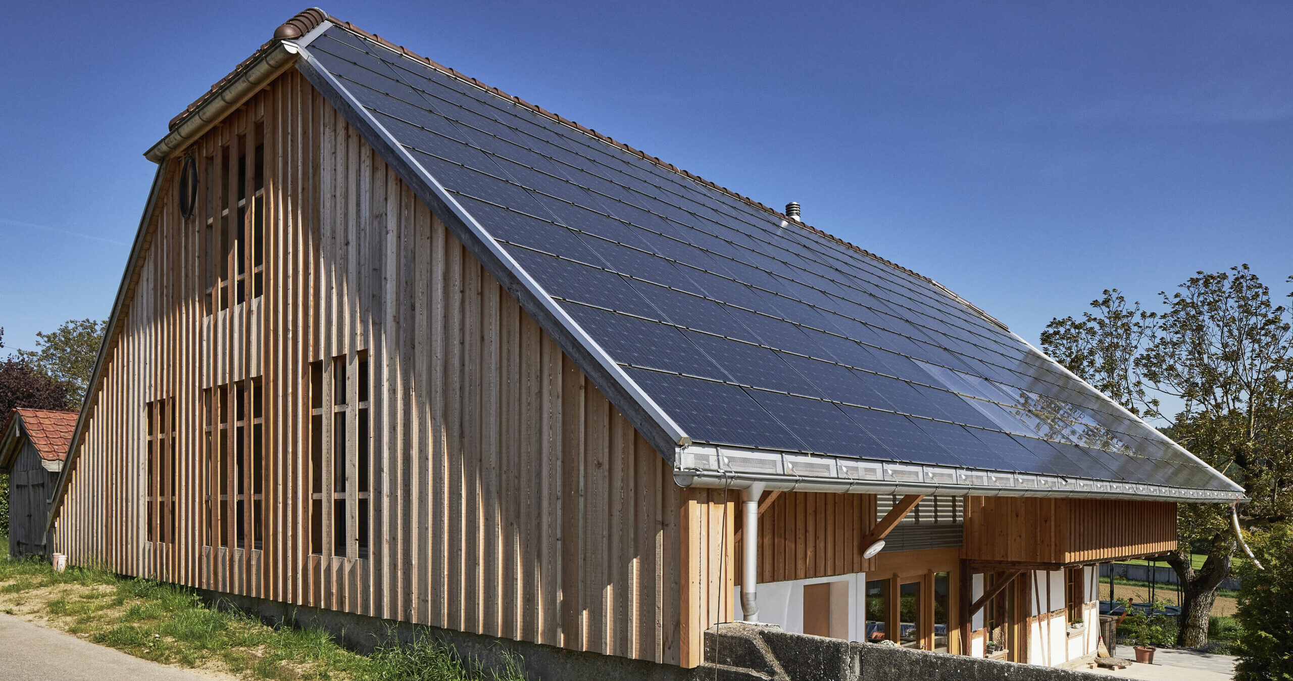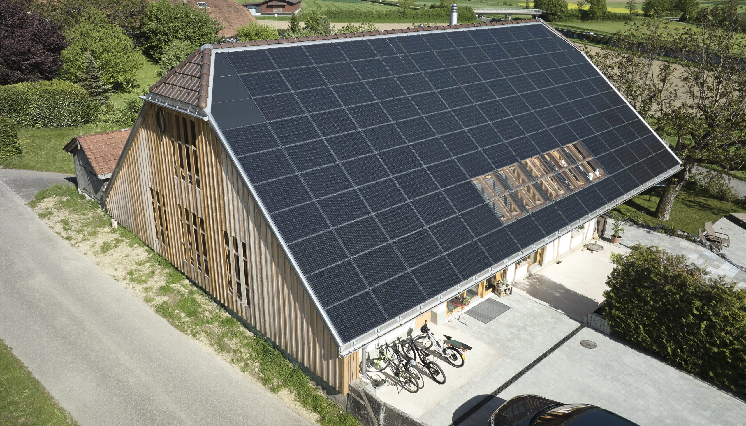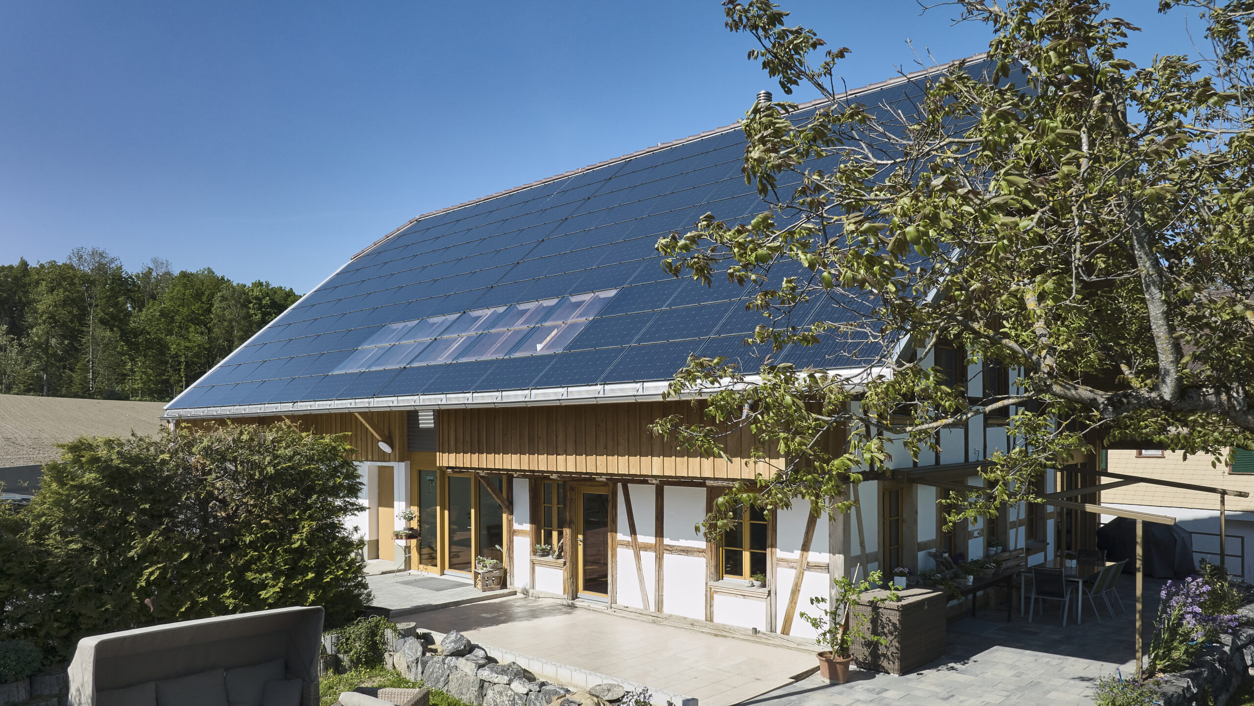 Für das Tageslicht unter dem grossen Vordach konzipierten wir eine Indach-Photovoltaikanlage mit integrierten Gläsern – diese bieten in den ehemals düsteren Räumen im Obergeschoss eine helle Belichtung und gewähren Aussicht. Neben einer umfangreichen Solaranlage integrierten wir auch eine Komfortlüftung. Dank der gezielten Steuerung der haustechnischen Geräte erreichen wir ausserdem eine hohe Eigenstromnutzung.