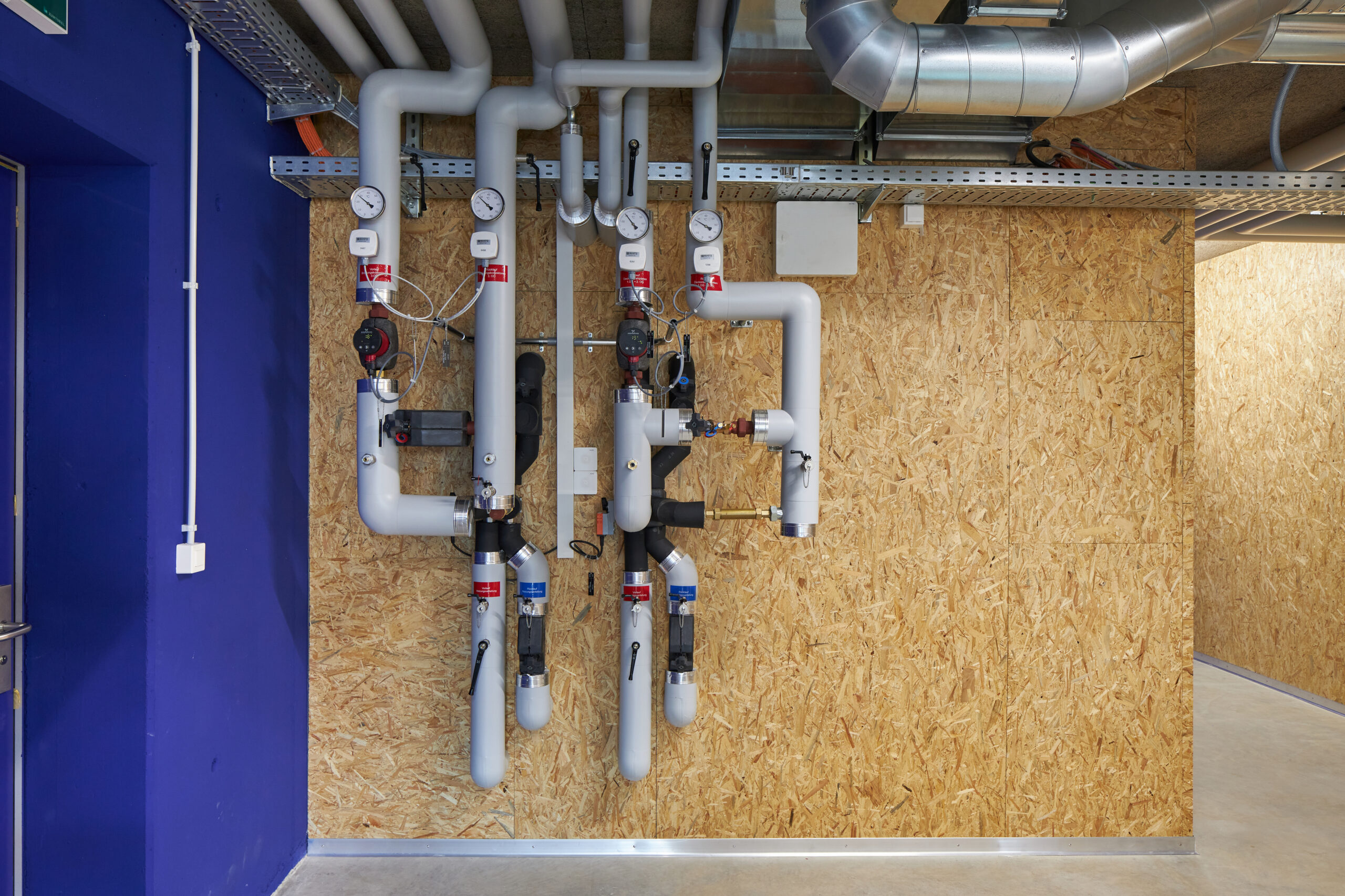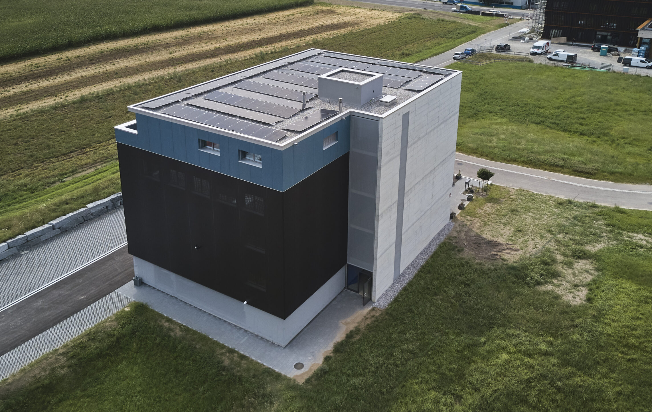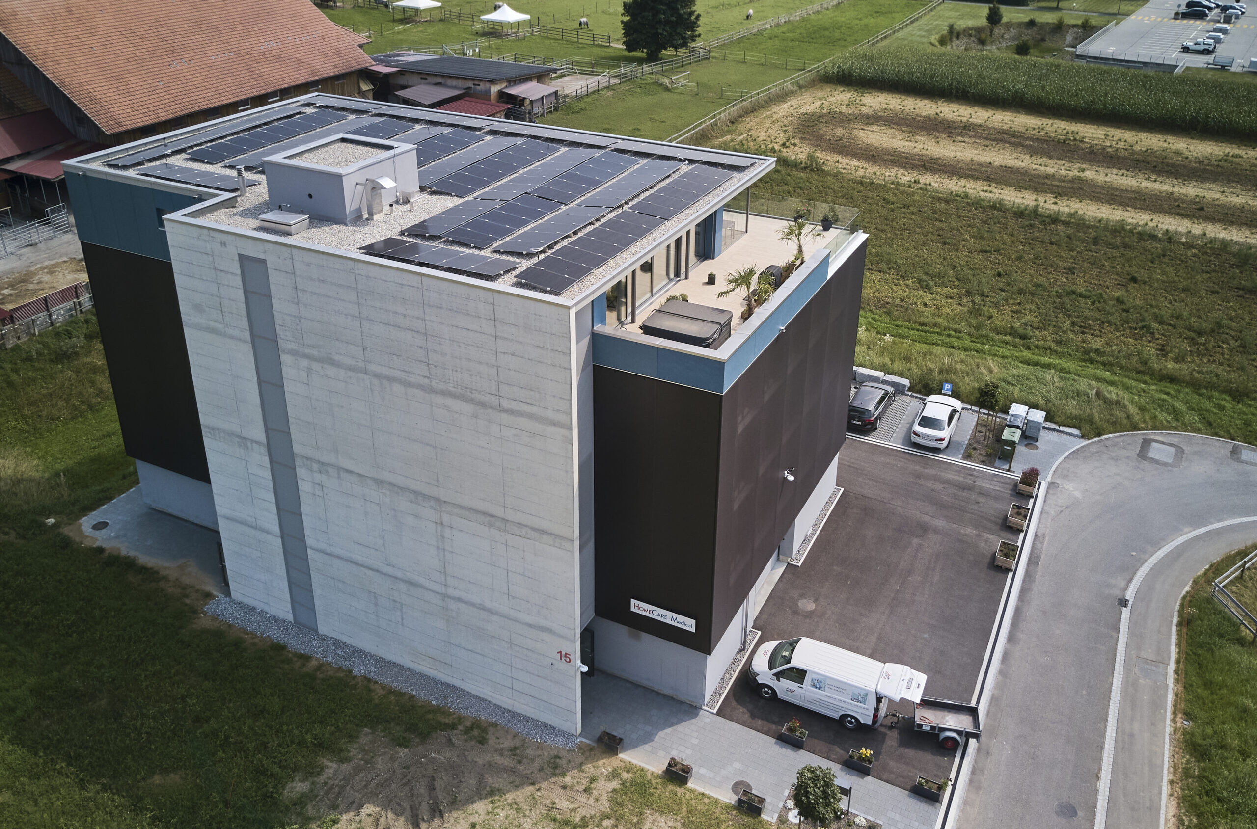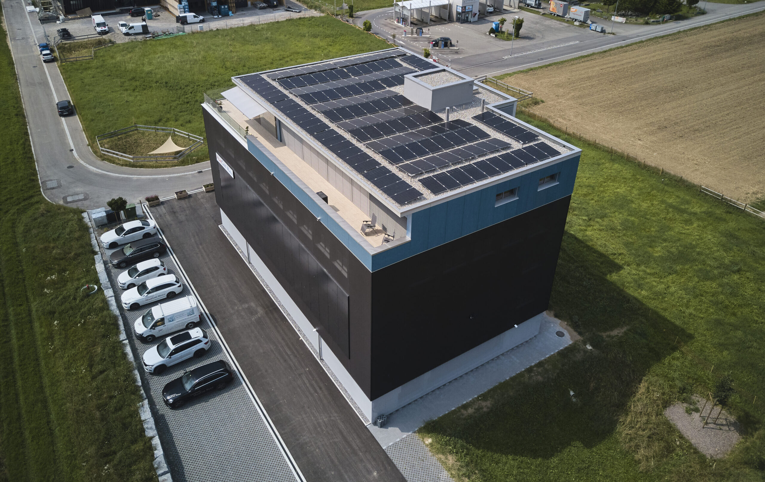Das ausgeklügelte Photovoltaikkonzept auf dem Dach und an der Fassade versorgt zusammen mit den grossen Stromspeichern den Gewerbebetrieb, die Wohnung und den Fahrzeugpark ganzjährig und beinahe autark mit Strom und gibt den Überschuss ins Netz ab. Die Wärme für die Raumheizung sowie die Warmwasseraufbereitung stammt aus dem Fernwärmenetz des örtlichen Wärmeverbunds. Die Kälte wird durch eine Umwälzpumpe mit sehr geringem Energieaufwand aus dem Grundwasser gewonnen und über einen Plattentauscher direkt ins Gebäude verteilt. Die Abgabesysteme kombiniert für die Beheizung und effiziente Kühlung wurden anforderungsgerecht ausgewählt. Nicht zuletzt sorgt eine Komfortlüftung im gesamten Gebäude für eine angenehme Raumluft; sie vermindert mit dem Wärmetauscher einen massiven Energieverlust gegenüber einer manuellen Fensterlüftung.