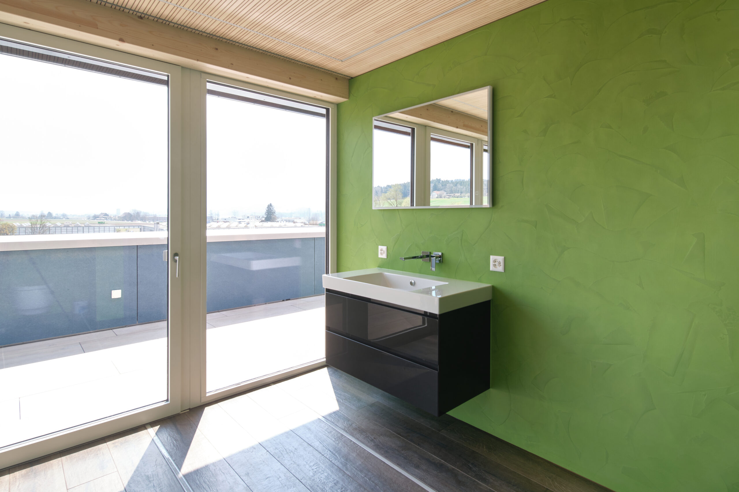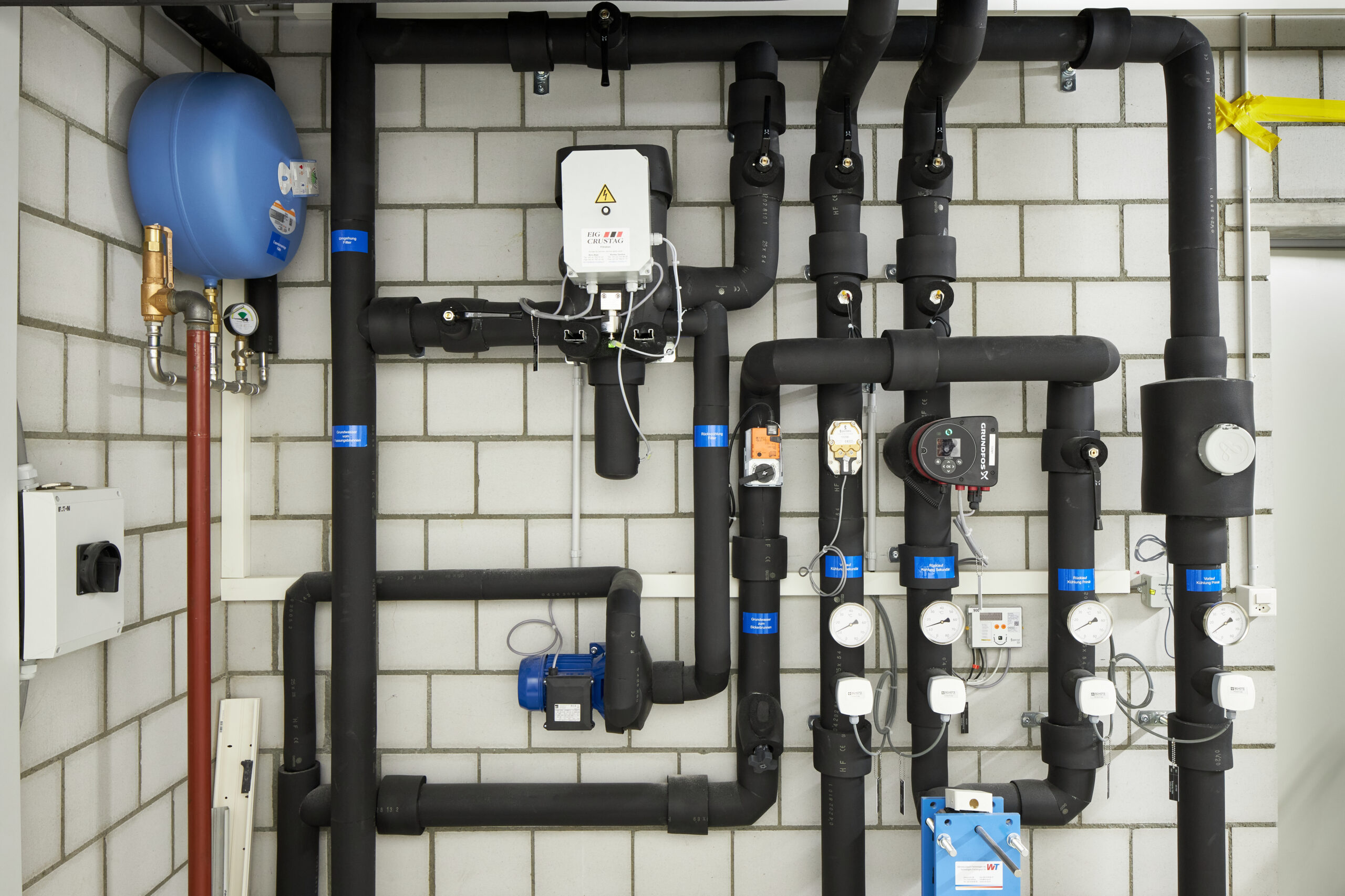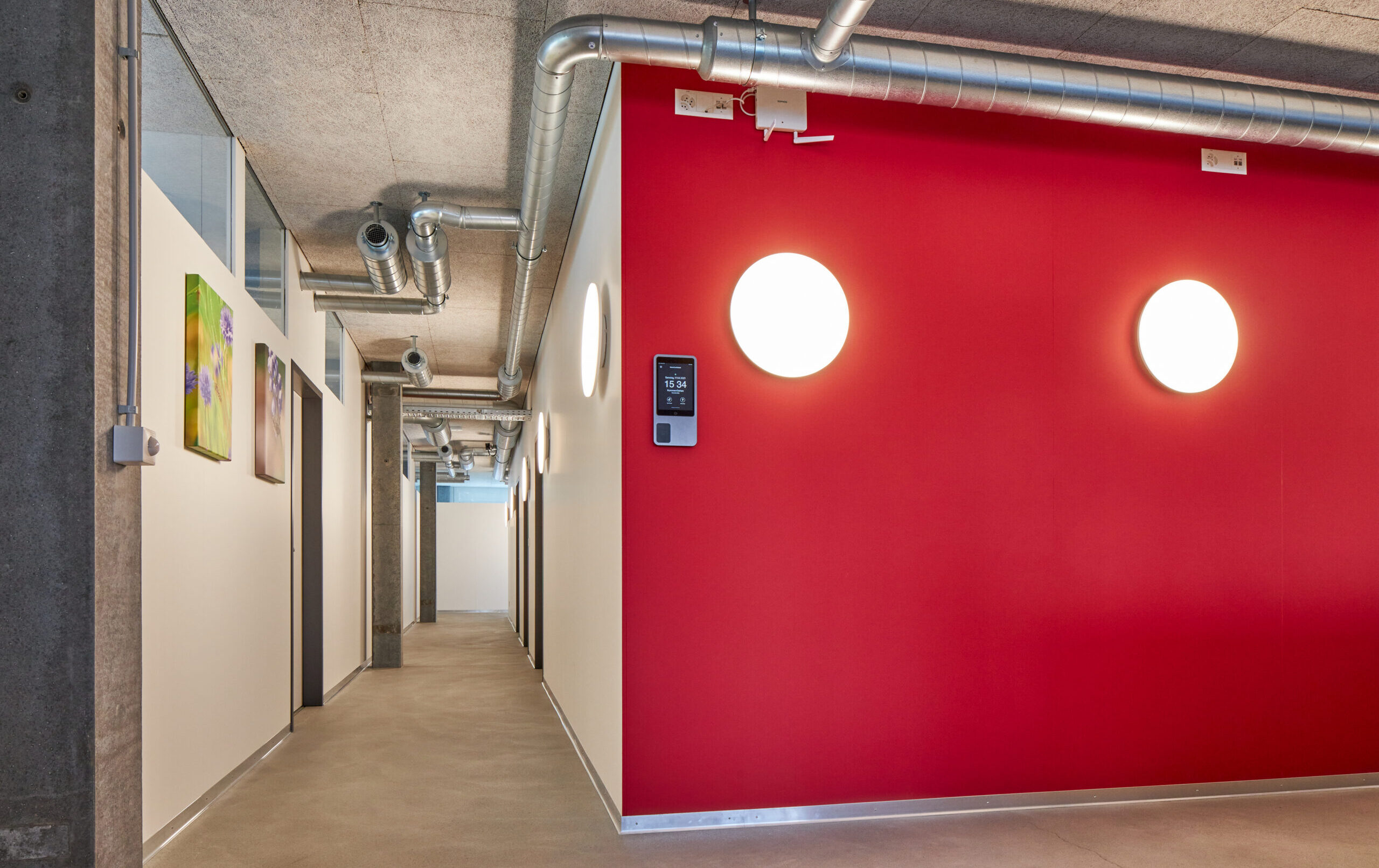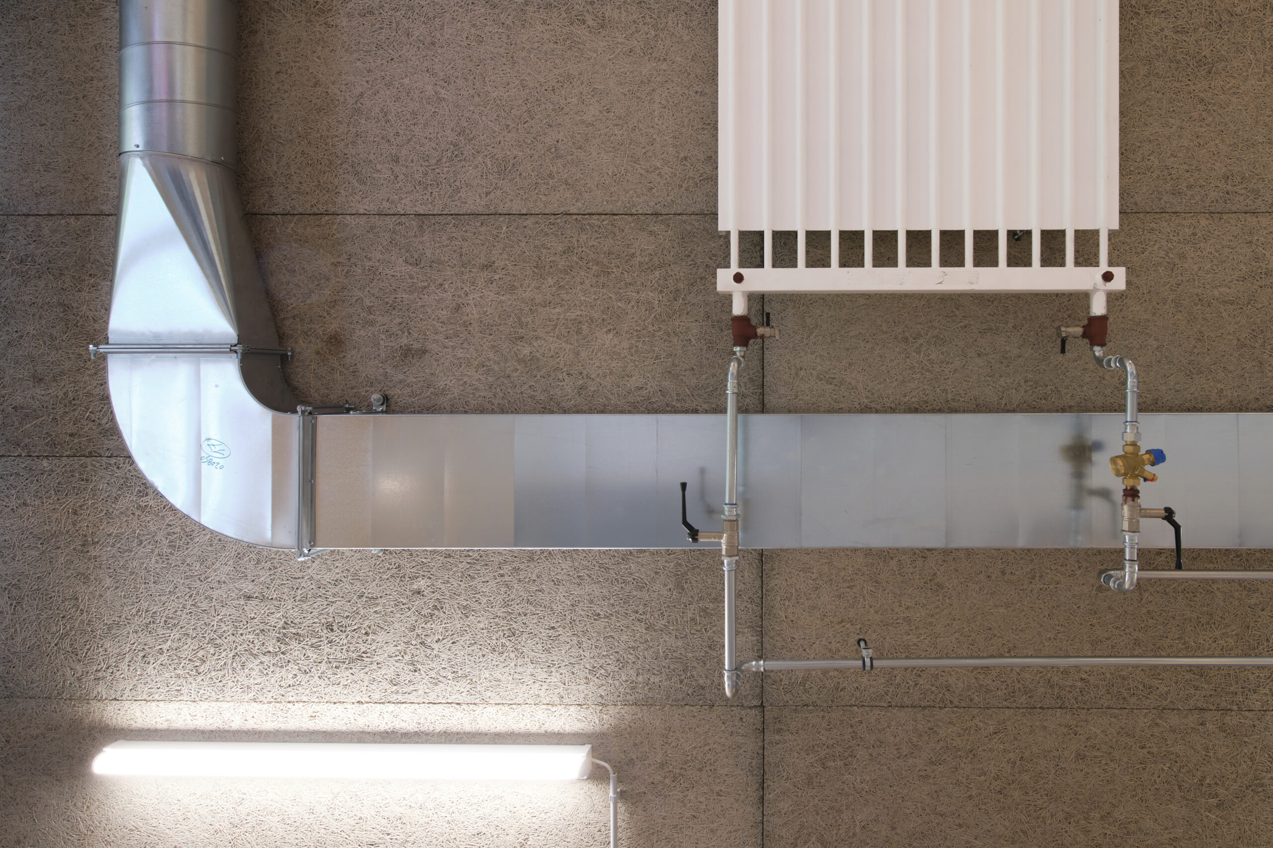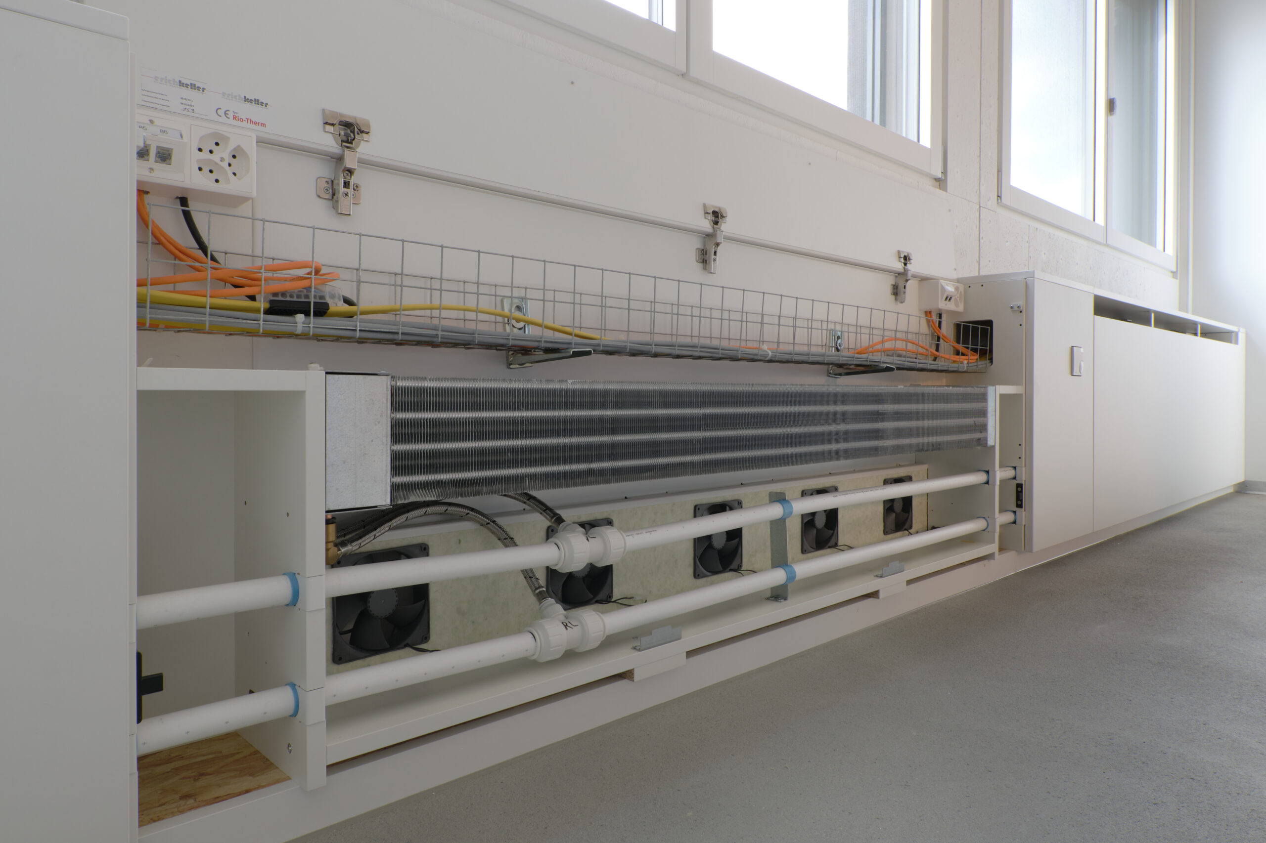 Das ausgeklügelte Photovoltaikkonzept auf dem Dach und an der Fassade versorgt zusammen mit den grossen Stromspeichern den Gewerbebetrieb, die Wohnung und den Fahrzeugpark ganzjährig und beinahe autark mit Strom und gibt den Überschuss ins Netz ab. Die Wärme für die Raumheizung sowie die Warmwasseraufbereitung stammt aus dem Fernwärmenetz des örtlichen Wärmeverbunds. Die Kälte wird durch eine Umwälzpumpe mit sehr geringem Energieaufwand aus dem Grundwasser gewonnen und über einen Plattentauscher direkt ins Gebäude verteilt. Die Abgabesysteme kombiniert für die Beheizung und effiziente Kühlung wurden anforderungsgerecht ausgewählt. Nicht zuletzt sorgt eine Komfortlüftung im gesamten Gebäude für eine angenehme Raumluft; sie vermindert mit dem Wärmetauscher einen massiven Energieverlust gegenüber einer manuellen Fensterlüftung.