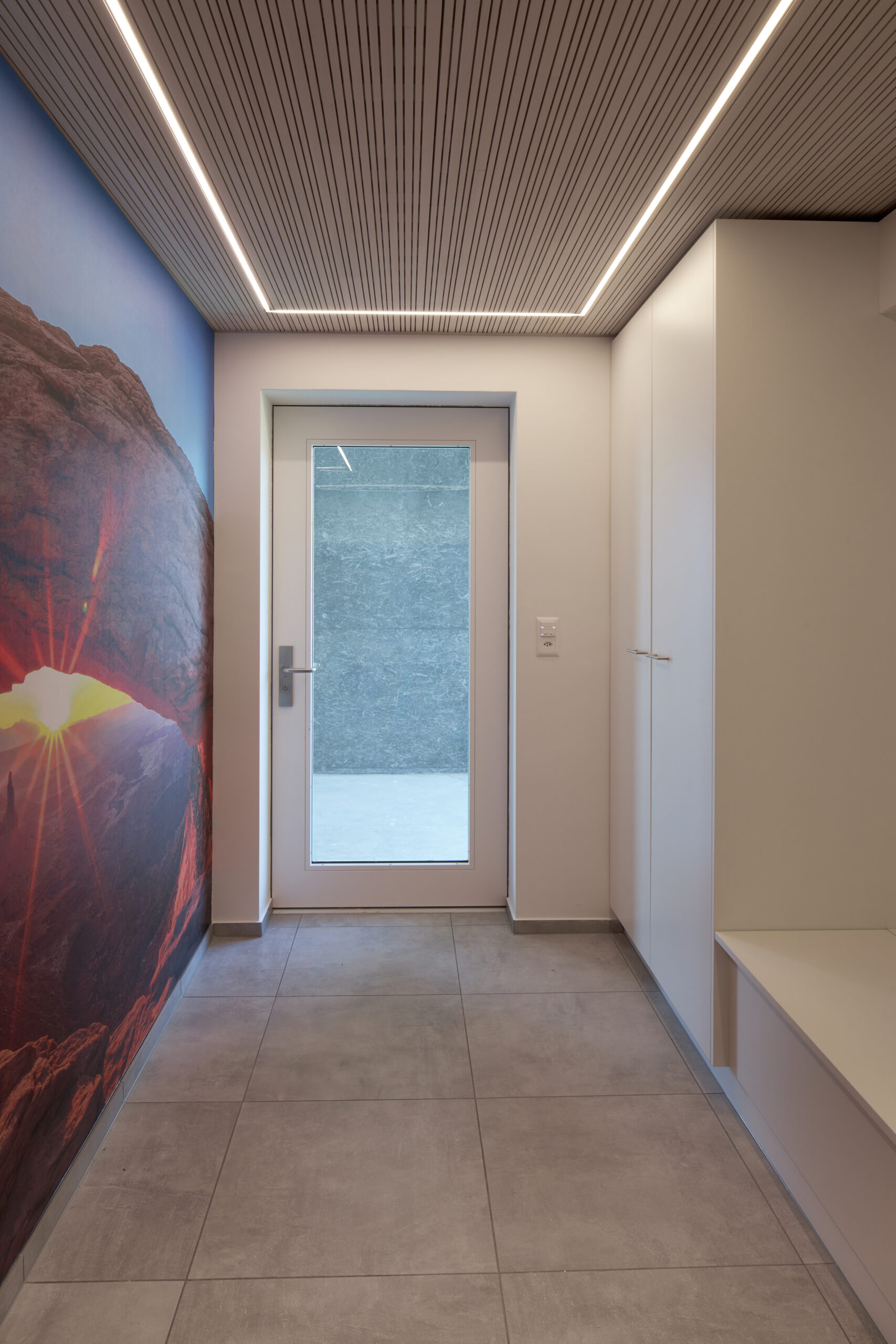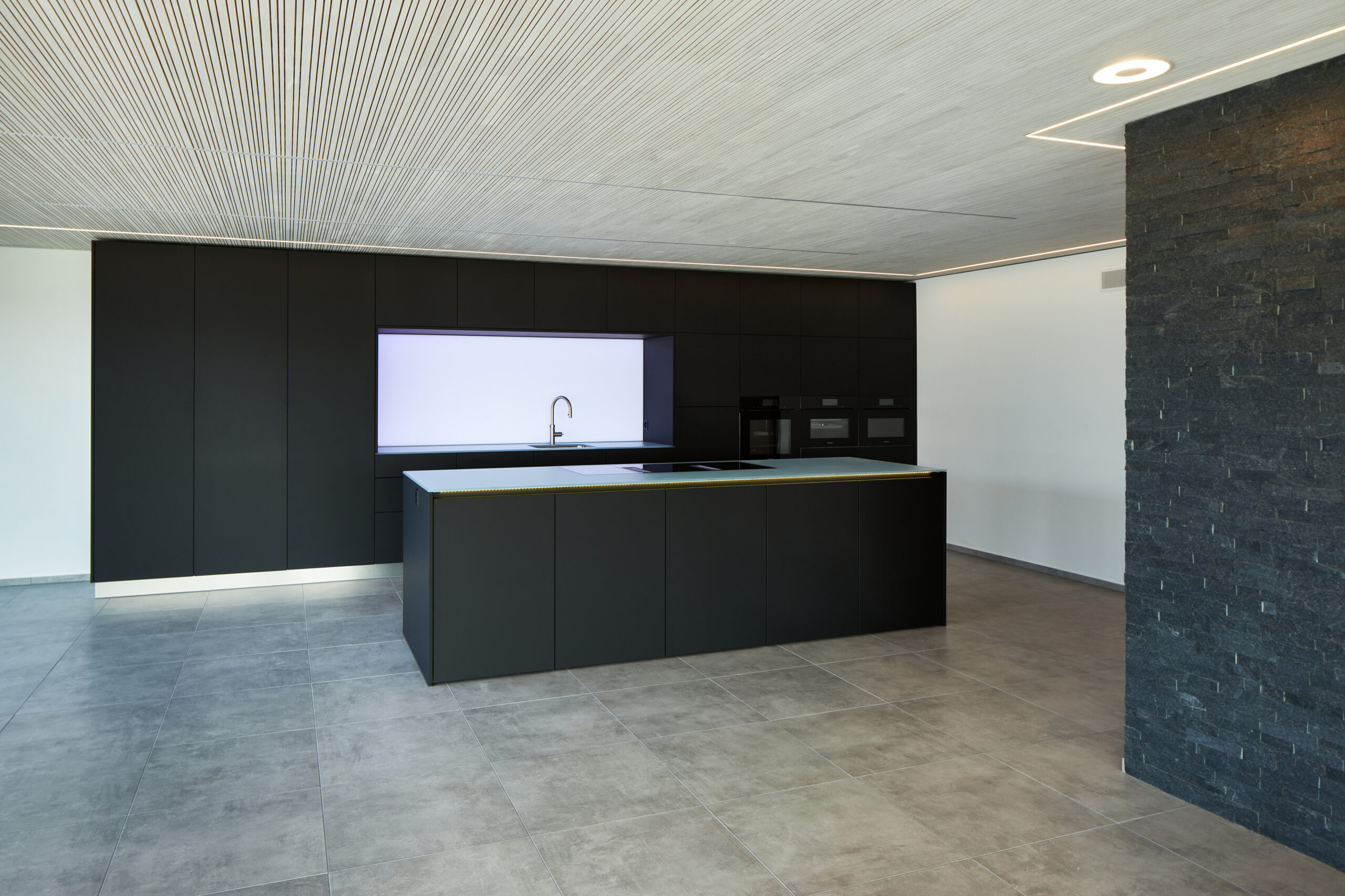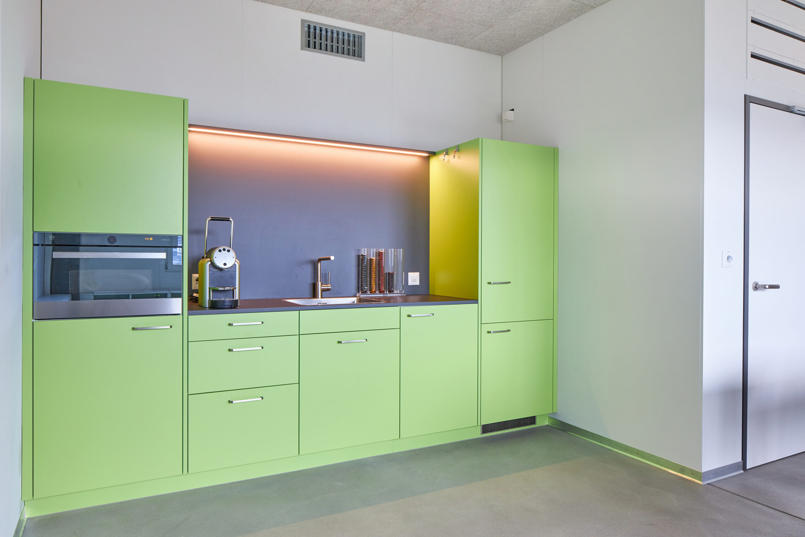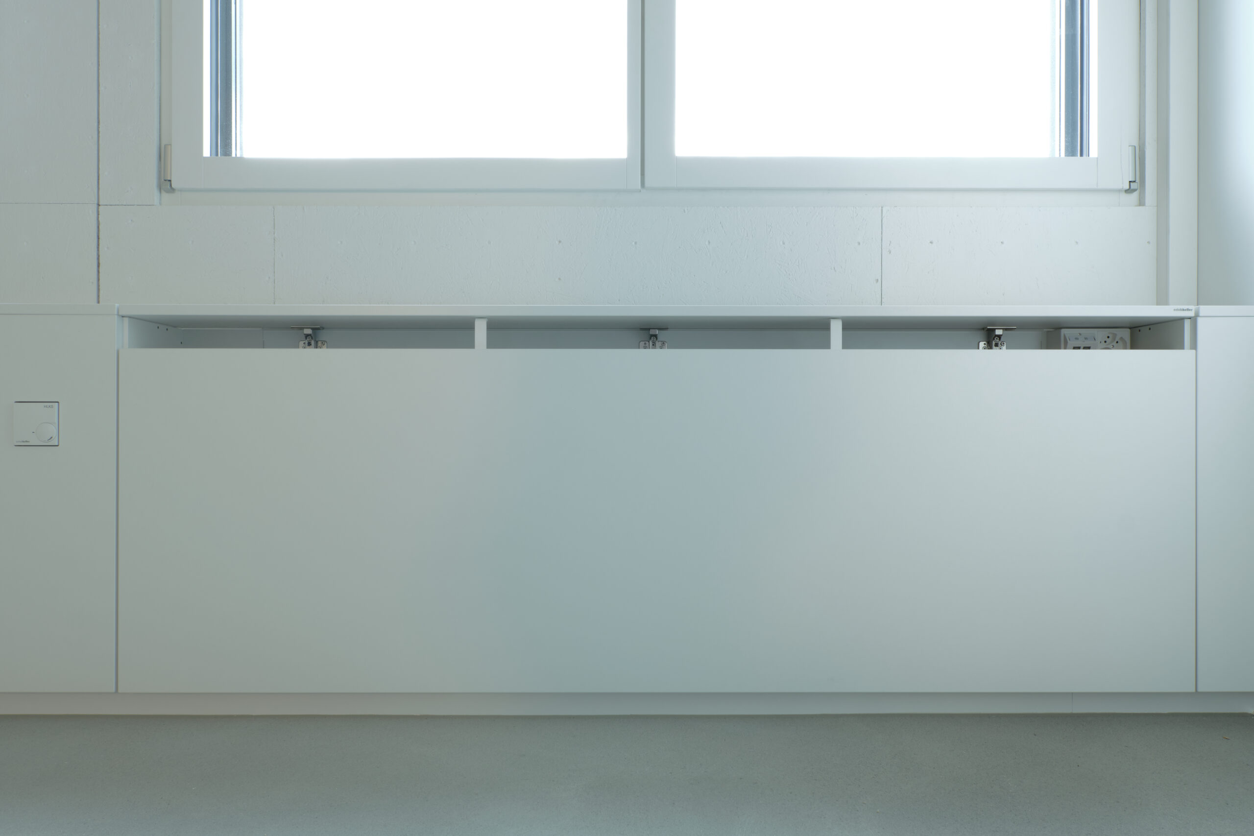 Das ausgeklügelte Photovoltaikkonzept auf dem Dach und an der Fassade versorgt zusammen mit den grossen Stromspeichern den Gewerbebetrieb, die Wohnung und den Fahrzeugpark ganzjährig und beinahe autark mit Strom und gibt den Überschuss ins Netz ab. Die Wärme für die Raumheizung sowie die Warmwasseraufbereitung stammt aus dem Fernwärmenetz des örtlichen Wärmeverbunds. Die Kälte wird durch eine Umwälzpumpe mit sehr geringem Energieaufwand aus dem Grundwasser gewonnen und über einen Plattentauscher direkt ins Gebäude verteilt. Die Abgabesysteme kombiniert für die Beheizung und effiziente Kühlung wurden anforderungsgerecht ausgewählt. Nicht zuletzt sorgt eine Komfortlüftung im gesamten Gebäude für eine angenehme Raumluft; sie vermindert mit dem Wärmetauscher einen massiven Energieverlust gegenüber einer manuellen Fensterlüftung.