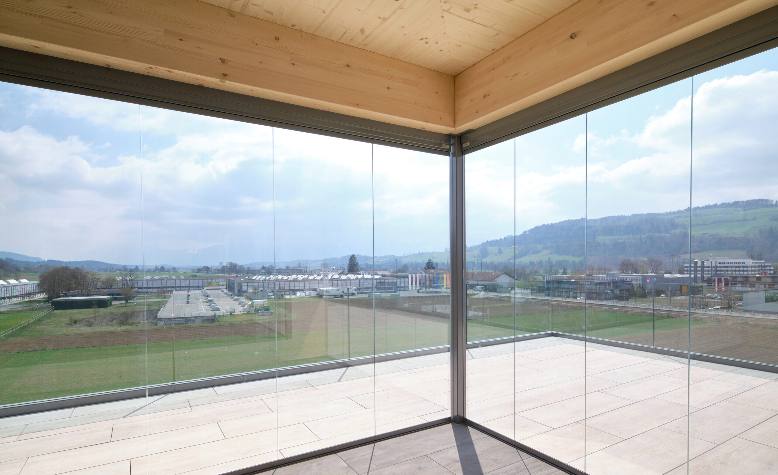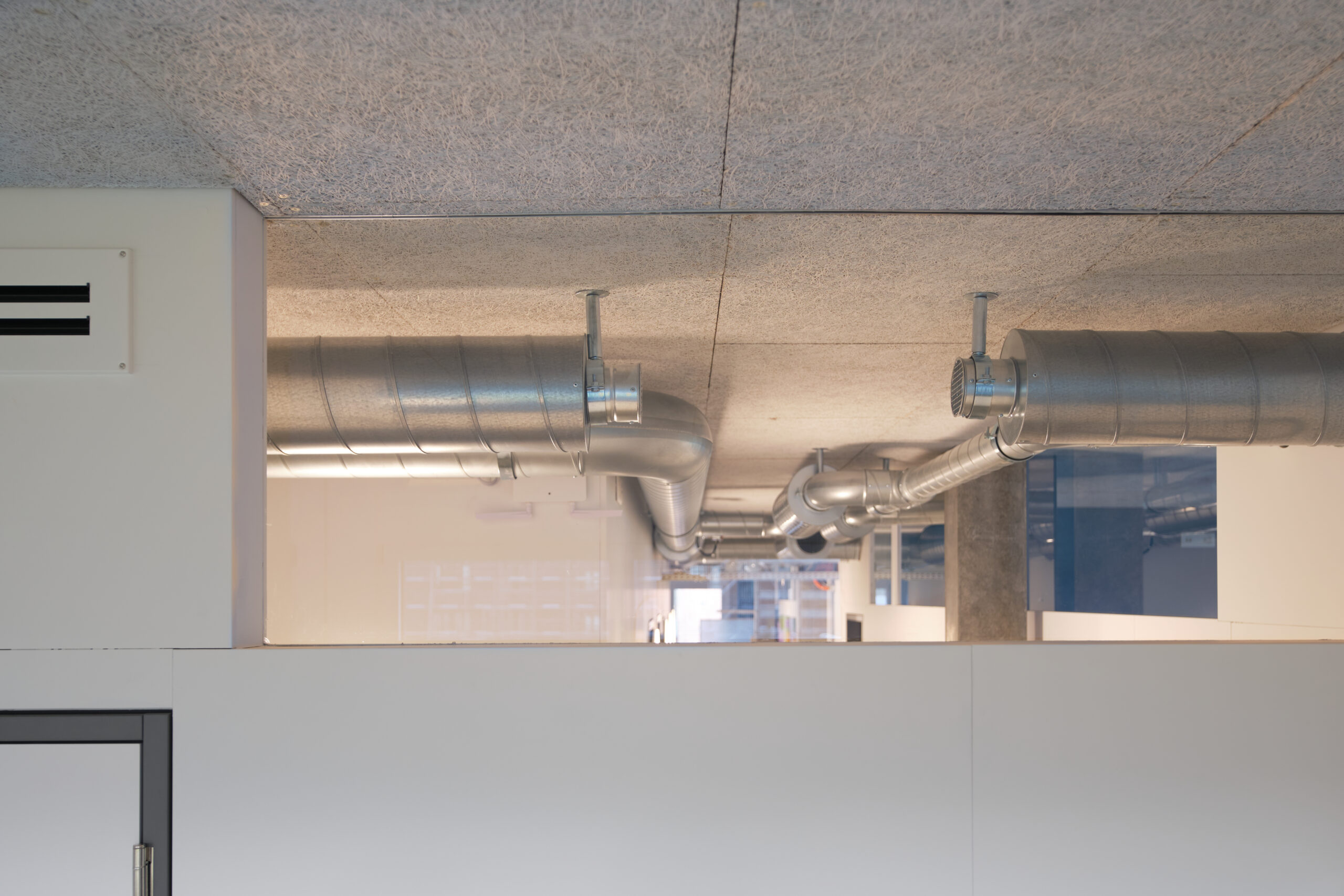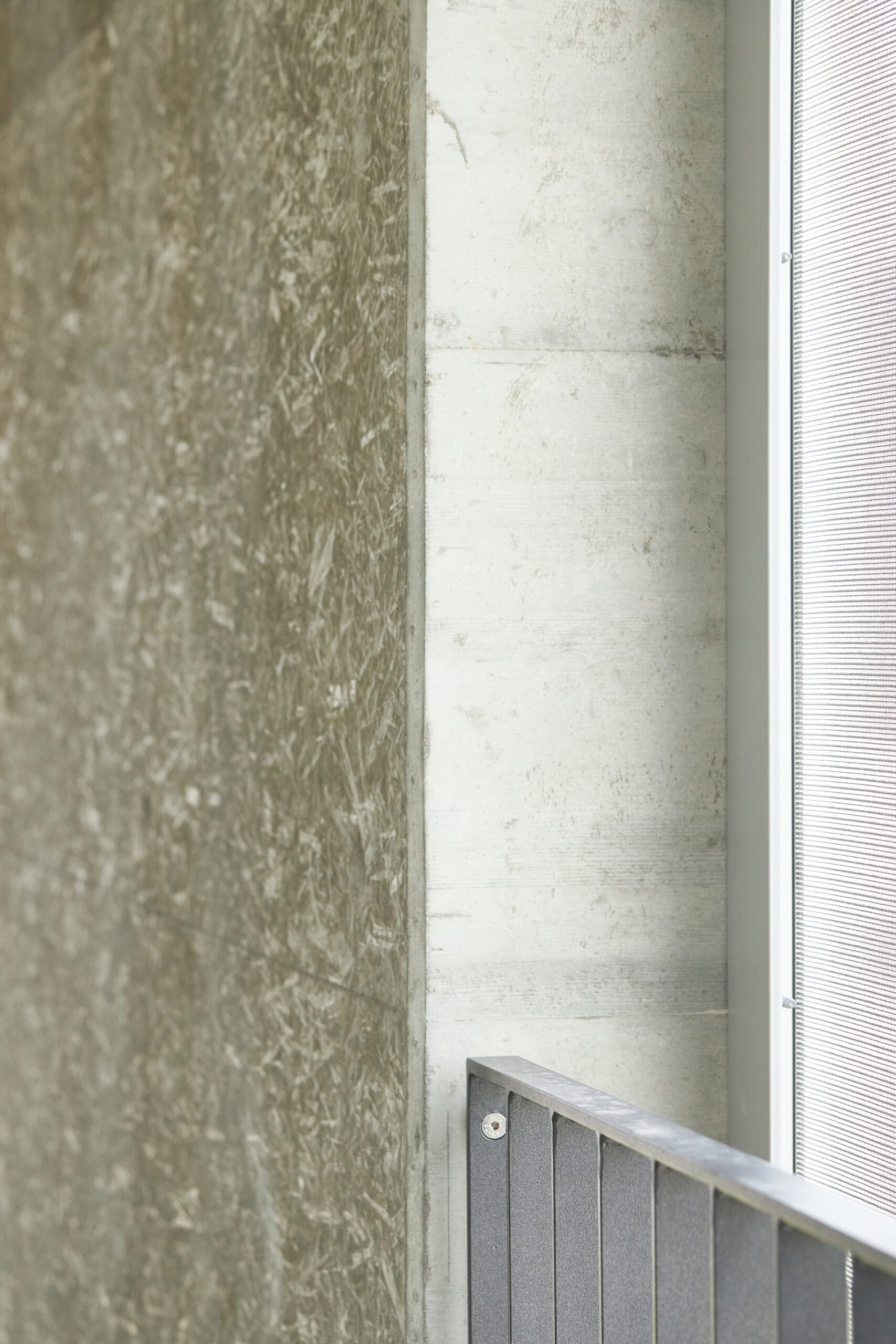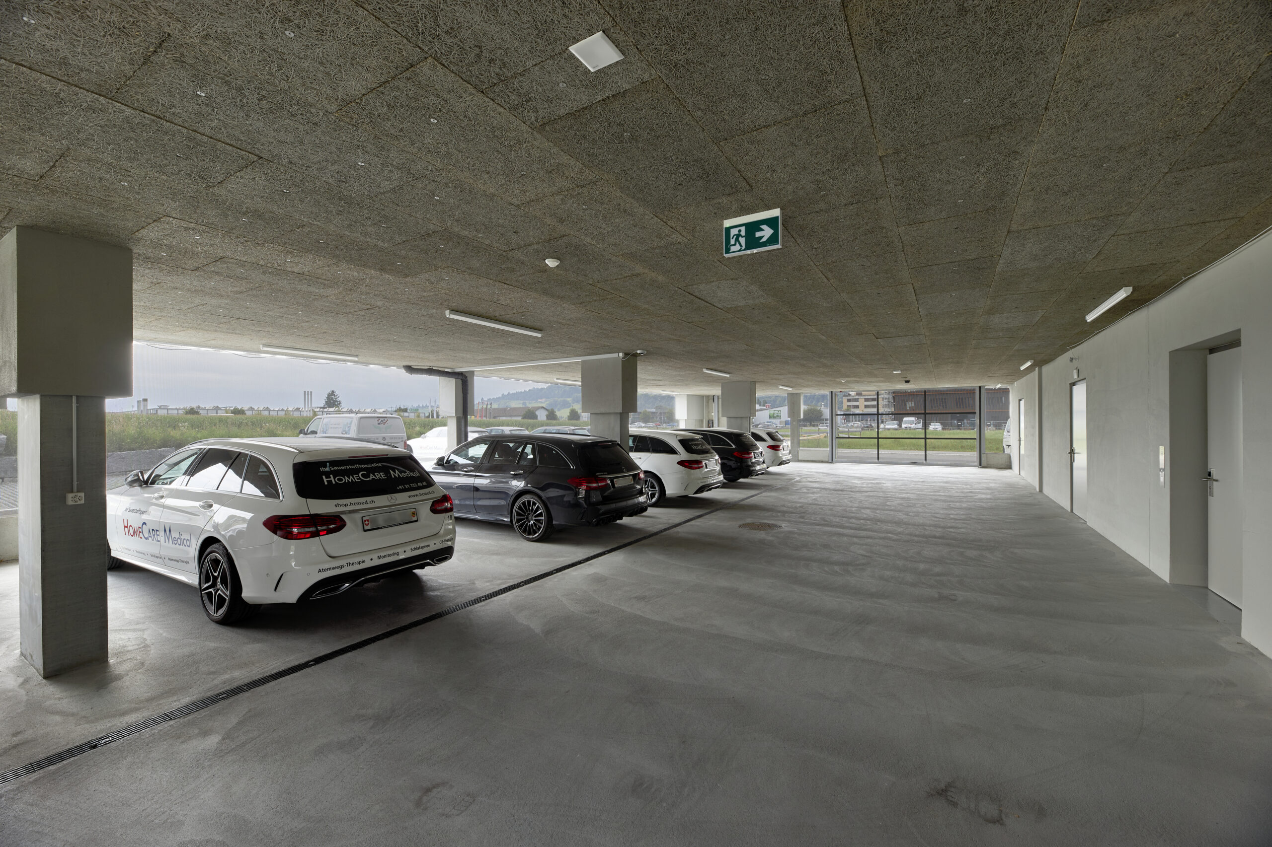 Dank der hybriden Bauweise (Tragwerk aus Stahlbeton, Fassaden und Attikageschoss aus Holzelementen) konnten die Baumaterialien auf Grund ihrer Eigenschaften optimal zur Erfüllung der Gebäudeanforderungen (Statik, Brandschutz, Schallschutz, Wärmeschutz) gewählt werden. Durch die vorgehängte Gewebefassade entsteht ein ruhiges, homogenes und ästhetisches Erscheinungsbild nach aussen – dahinter verdeckt eine für den Betrieb funktionelle unregelmässige Fenstereinteilung.