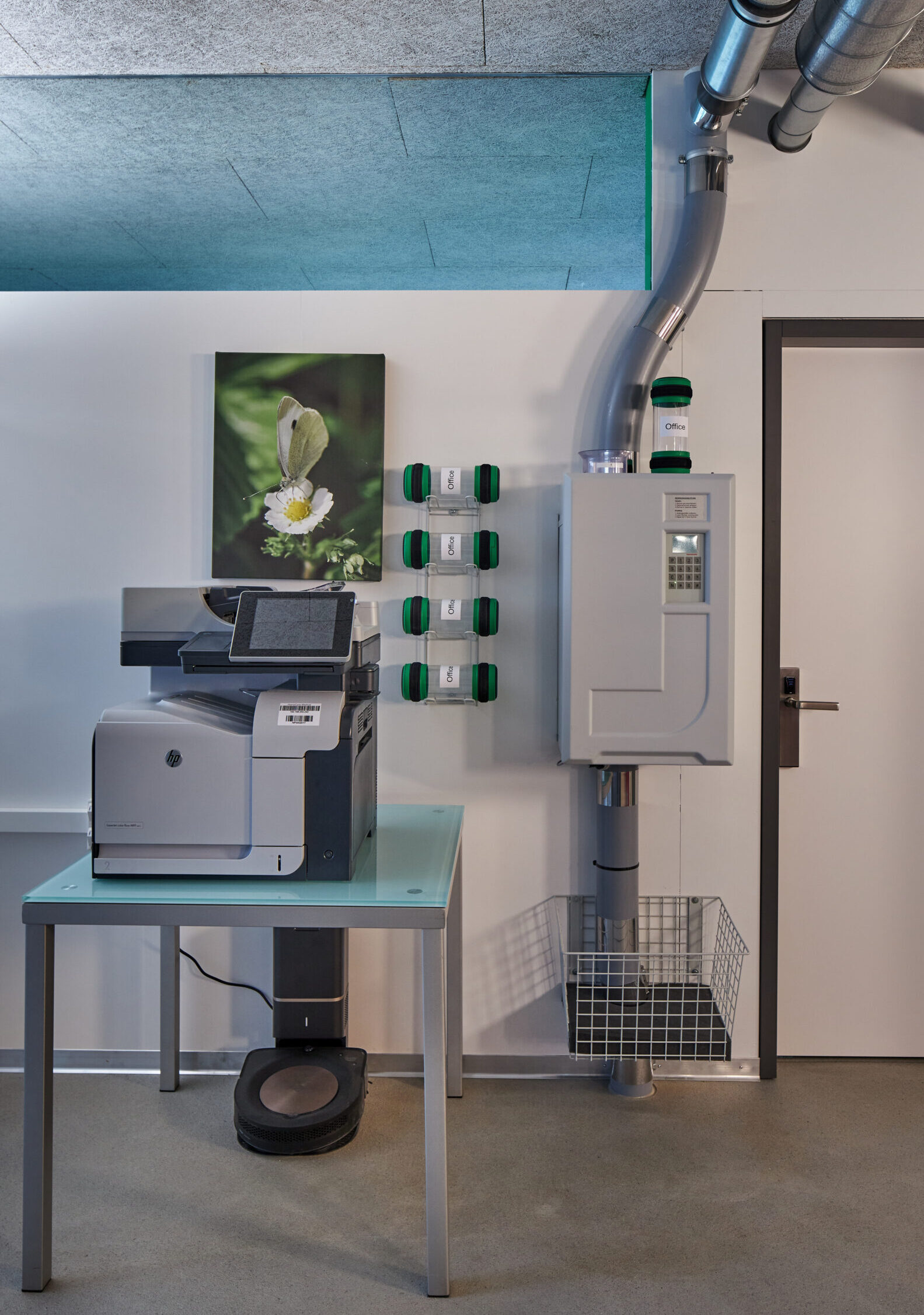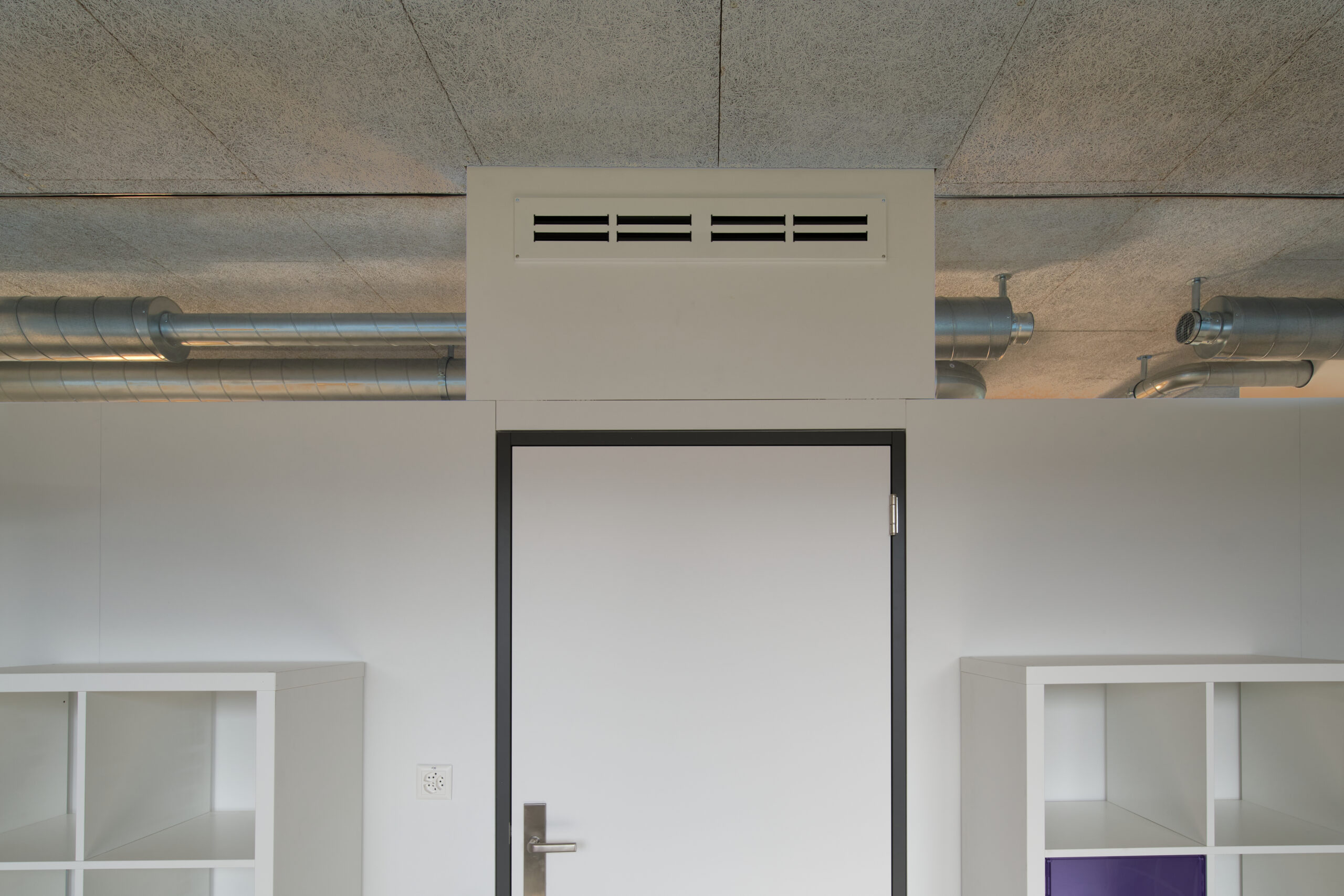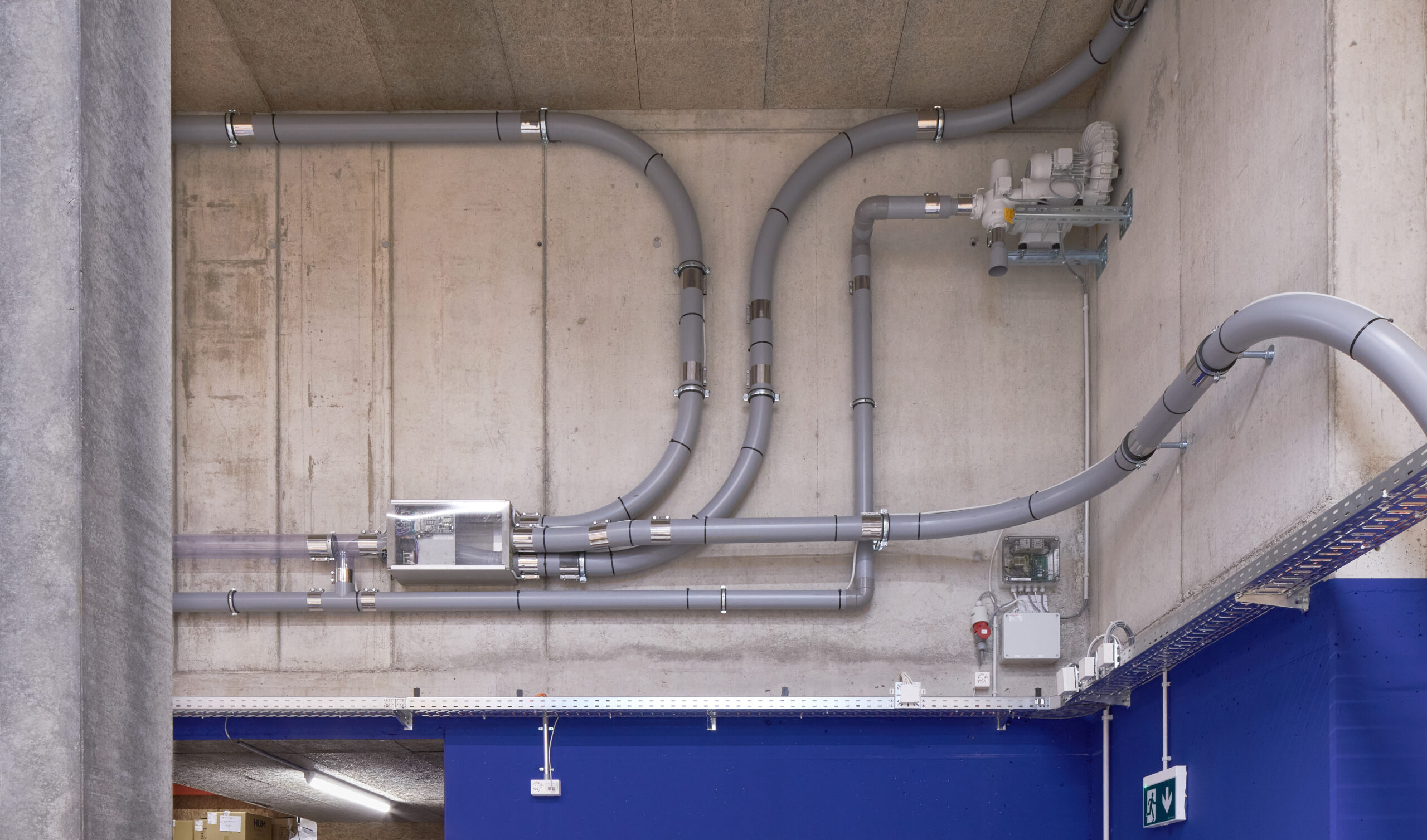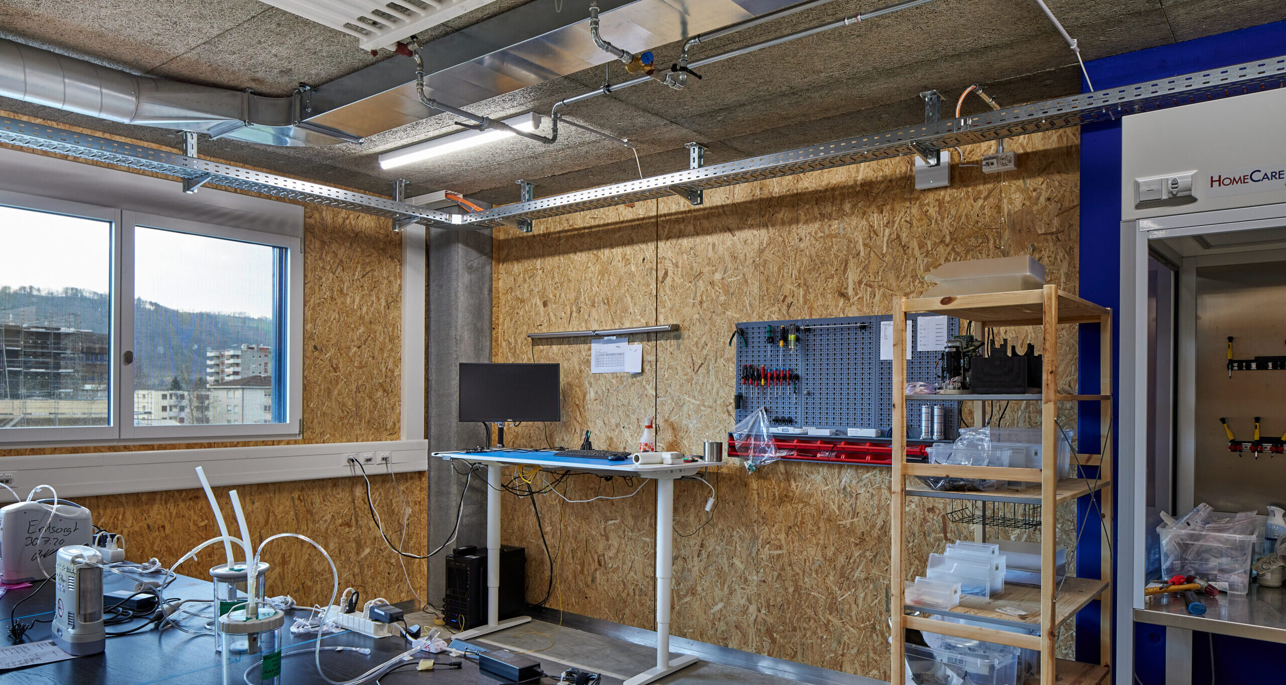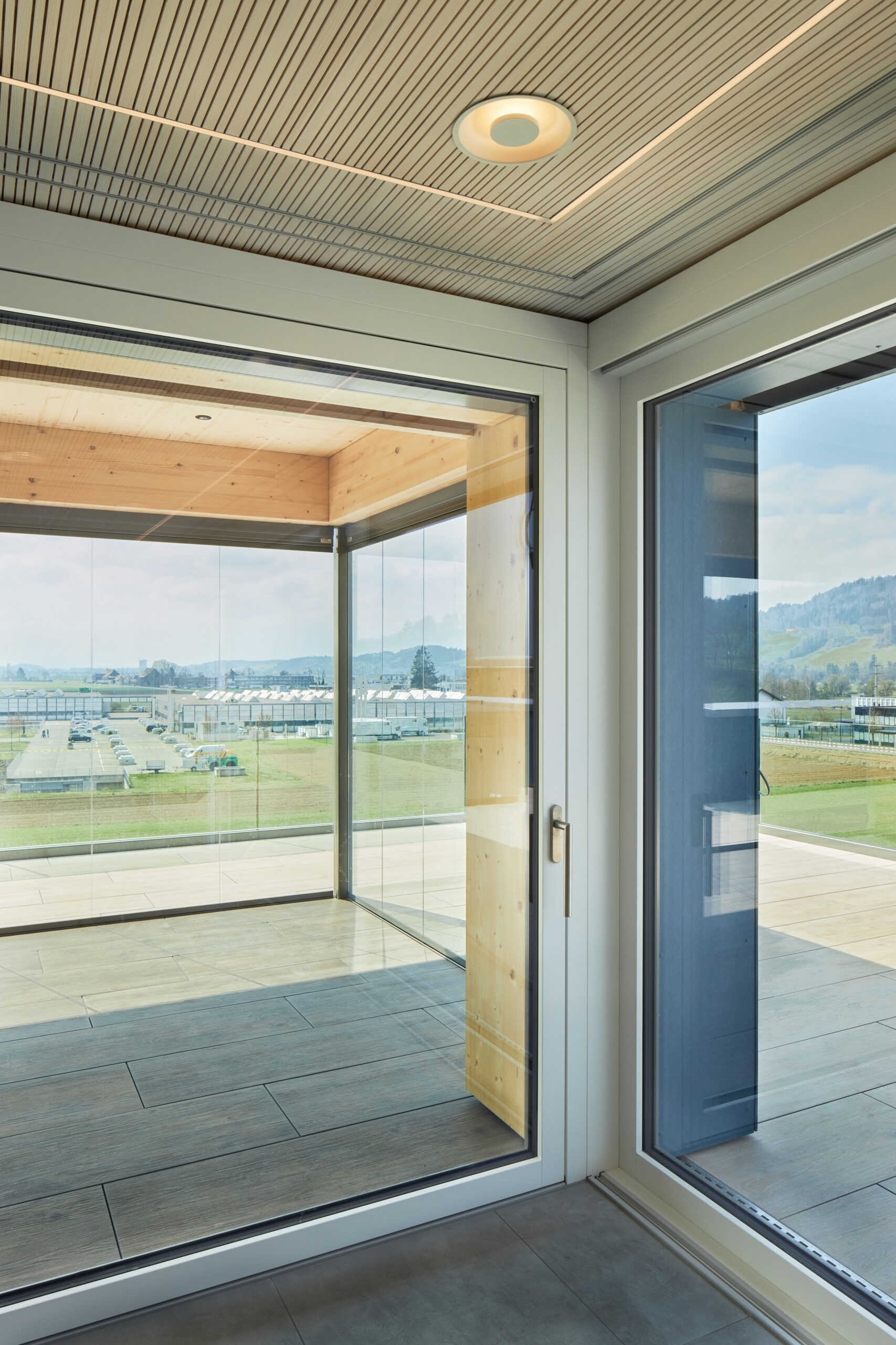 Dank der hybriden Bauweise (Tragwerk aus Stahlbeton, Fassaden und Attikageschoss aus Holzelementen) konnten die Baumaterialien auf Grund ihrer Eigenschaften optimal zur Erfüllung der Gebäudeanforderungen (Statik, Brandschutz, Schallschutz, Wärmeschutz) gewählt werden. Durch die vorgehängte Gewebefassade entsteht ein ruhiges, homogenes und ästhetisches Erscheinungsbild nach aussen – dahinter verdeckt eine für den Betrieb funktionelle unregelmässige Fenstereinteilung.