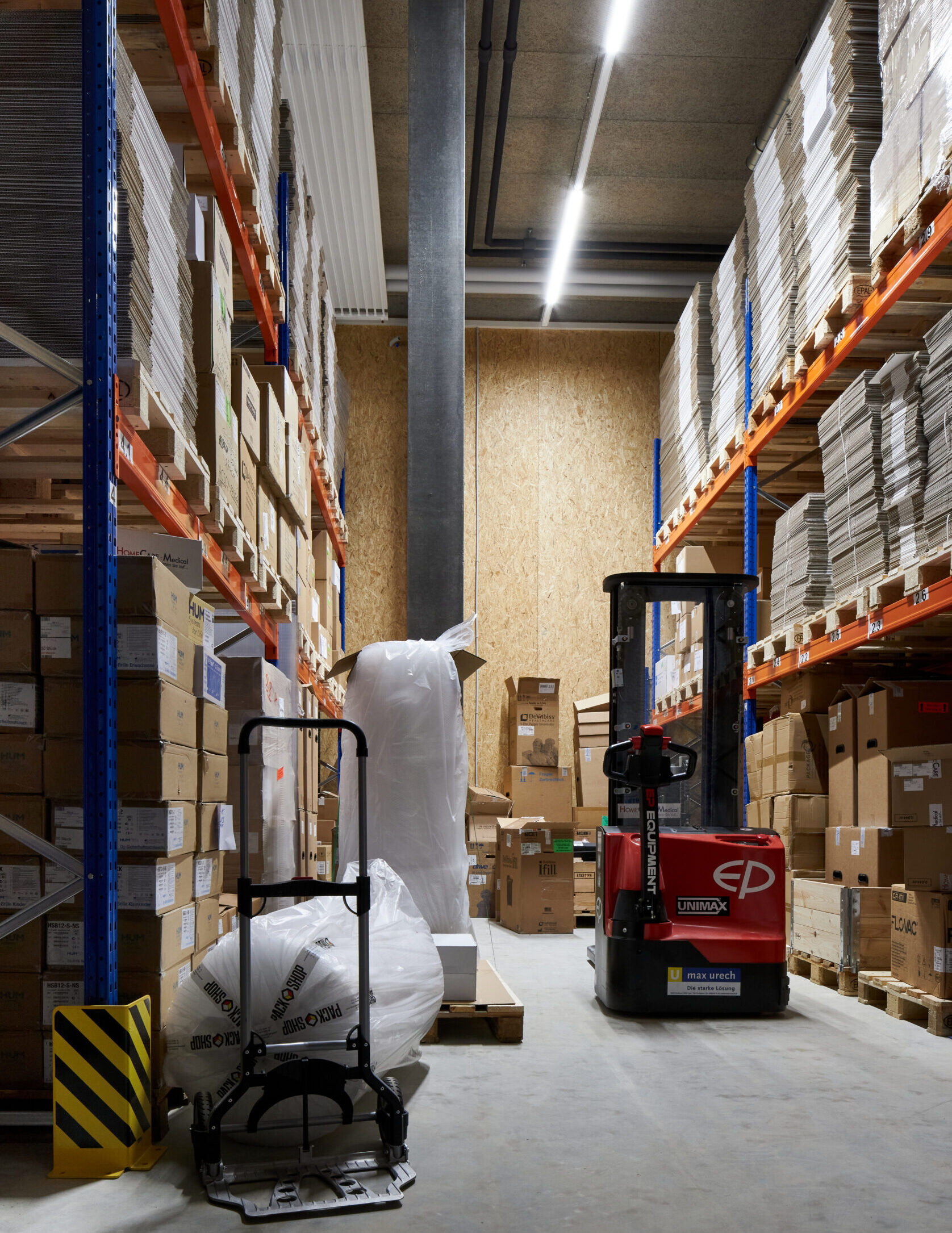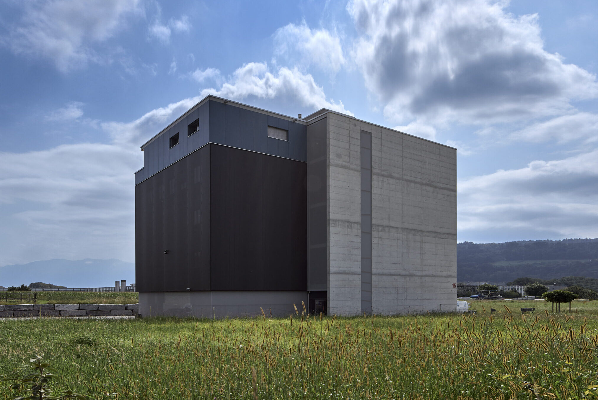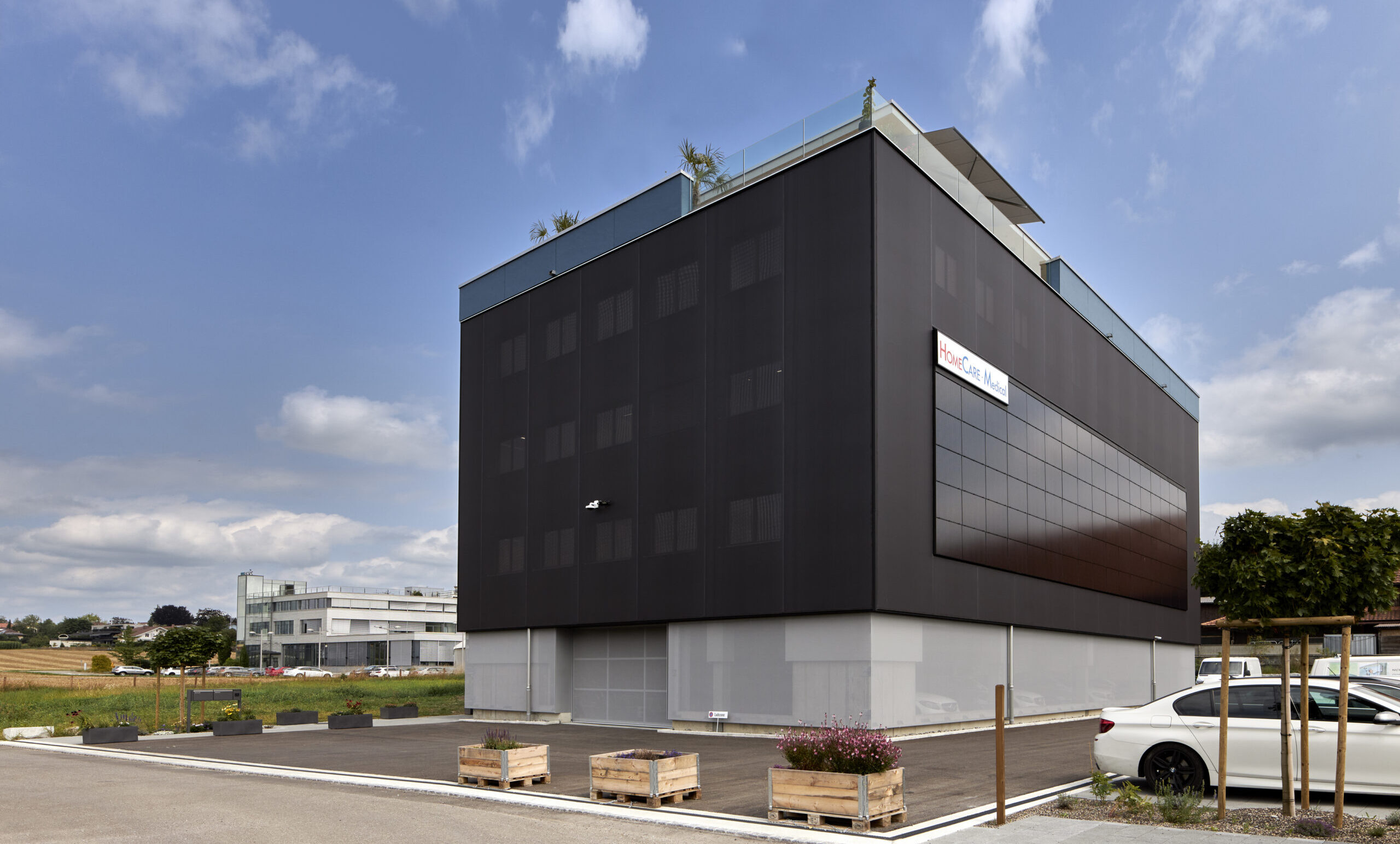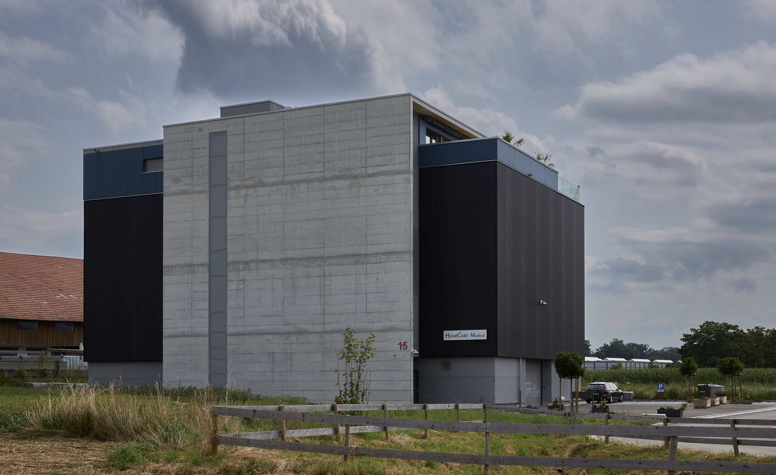 Der Neubau des Wohn- und Gewerbegebäudes erfüllt den Minergie-A-Standard. Um Kosten zu sparen wurde auf eine Unterkellerung verzichtet und die Einstellhalle stattdessen im Erdgeschoss gebaut. In den Obergeschossen wurden die Werkstätte, die Hochregallager und die Büros angelegt – zuoberst eine grosszügige Attikawohnung.